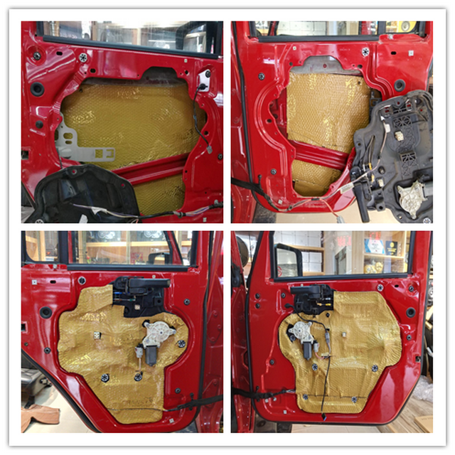 拆开汽车的门板饰盖以后,可以看到原车门板内部未作任何有效隔音处理。改装技师使用大白鲨金鲨,对汽车的门板做了双层隔音处理,大白鲨金鲨采用高级丁基胶特制而成,复合高韧性铝箔,具有超强的密封效果,可以有效阻止风噪的传入。