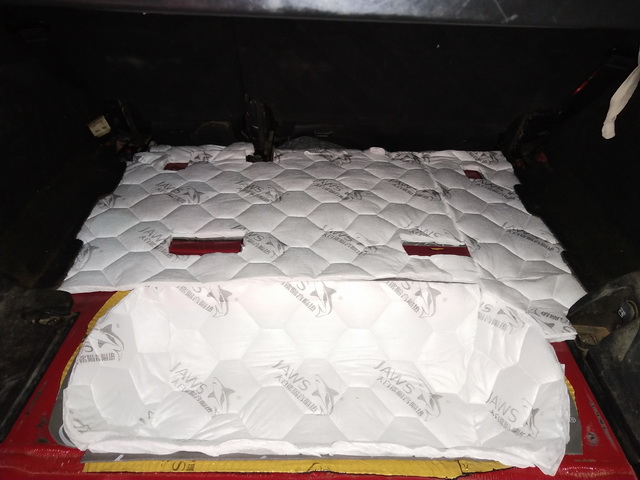 底盘和尾箱是共振的主要产生部位,但原车的底盘和尾箱,只有一层光秃秃的铁皮结构,根本未作任何隔音处理。导致底盘和尾箱部位的噪声也非常的大。所以改装技师,先使用大白鲨金鲨,对汽车的底盘和尾箱做了第一层的止振处理,降低底盘和尾箱的共振噪声和机械噪声;然后使用大白鲨低频王,对底盘和尾箱做第二层密封处理,降低底盘和尾箱的低频共振噪声;最后使用大白鲨白棉,对底盘和尾箱做第三层密封处理,以使得隔音效果更为理想。