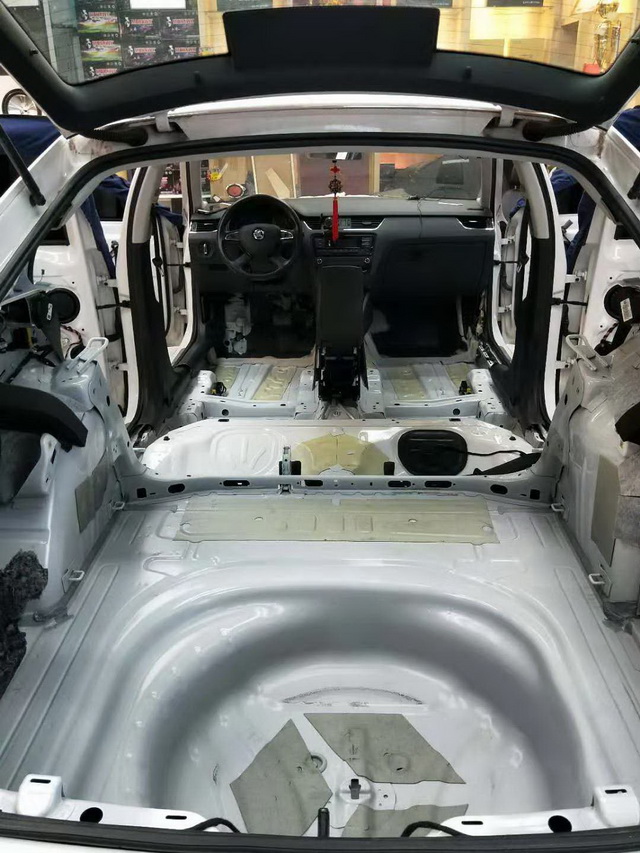 经过检测,改装技师发现车厢内的噪声主要有风噪、胎噪和共振噪声,如果高速行驶的时候发动机舱内的机械噪声也会非常的明显。因此改装技师针对性的定制了斯柯达明锐全车隔音降噪解决方案。