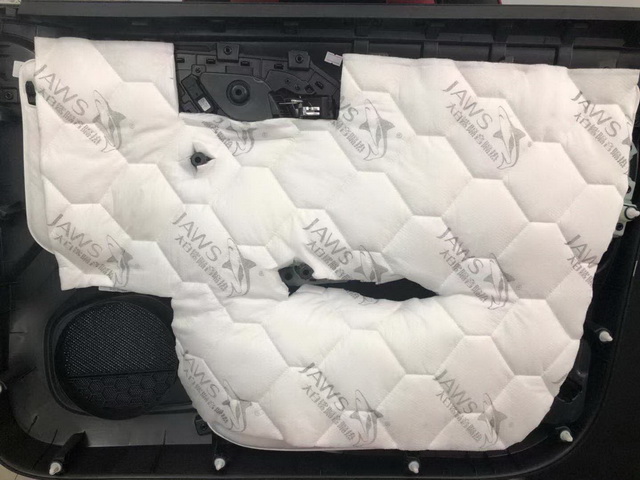 风噪主要通过门板传入到车厢内部,因此改装技师使用大白鲨黄金甲隔音减震胶,对汽车的门板做了双层的隔音处理,它用高级丁基胶特制而成,复合高韧性铝箔,具有超强的密封功能,这就让门板形成了一个密封的箱体,有效减少了风噪的传入。为了使得隔音更加彻底,改装技师还使用大白鲨白棉,对门板饰盖做了进一步的隔音处理。
