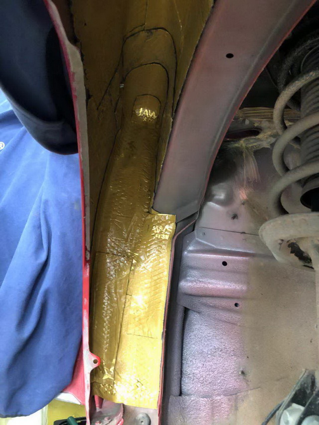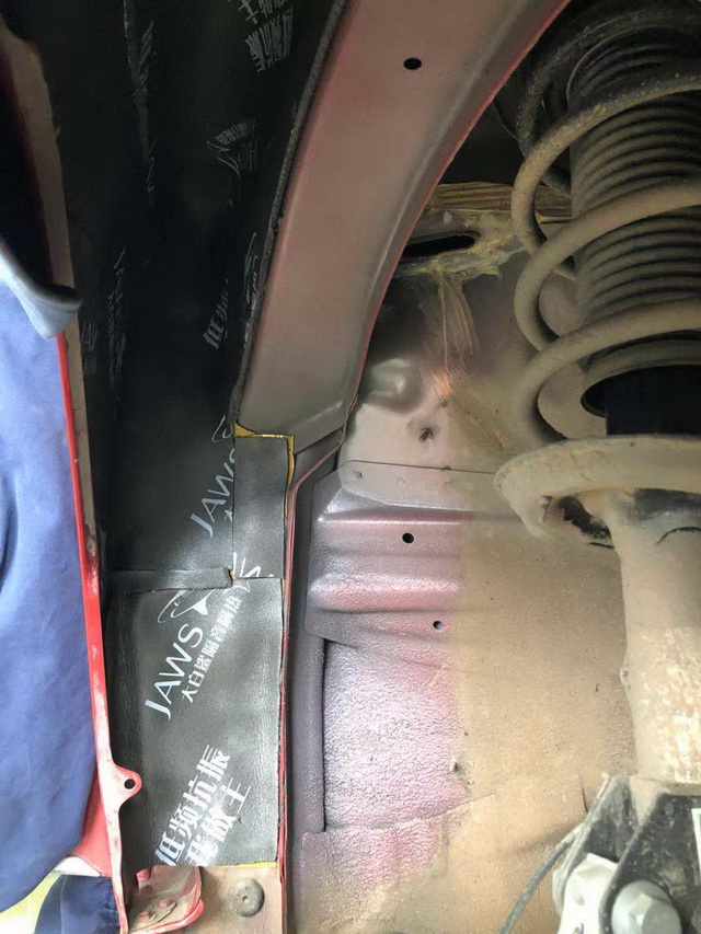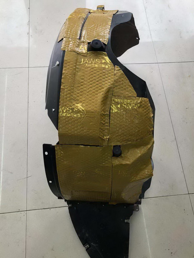汽车在行驶的时候,会产生很大的胎噪,此类噪声主要通过轮弧传入到车厢内部。改装技师将汽车的叶子板拆除,先使用大白鲨隔音材料,对汽车的轮弧做了三层隔音处理,然后又使用大白鲨黄金甲隔音减震胶,对叶子板做了隔音处理,这就切断了胎噪的传播途径,减少了胎噪的传入