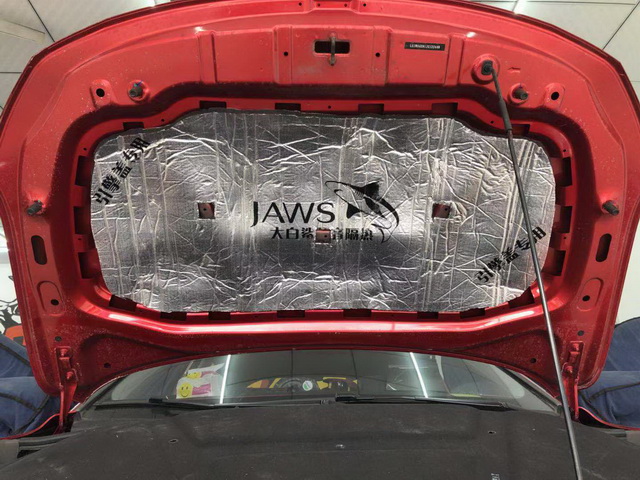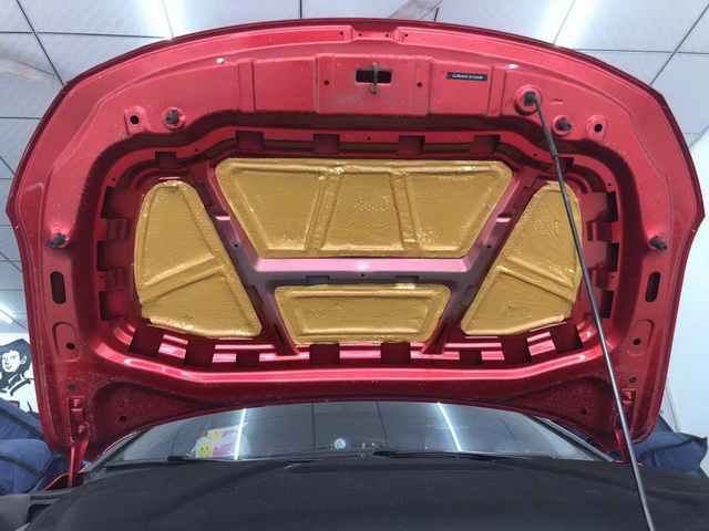 发动机在工作的时候,不仅会产生噪声,同时发动机工作产生的热量,也会加速引擎盖漆面的老化速度。改装技师在使用大白鲨黄金甲隔音减震胶,对引擎盖做了止振处理之后,又使用大白鲨引擎膜,对引擎盖做了第二层的隔热处理,从而对引擎盖起到了保护作用。而为了减少机械噪声的传入,改装技师还使用大白鲨黄金甲隔音减震胶,对U型槽做了隔音处理。