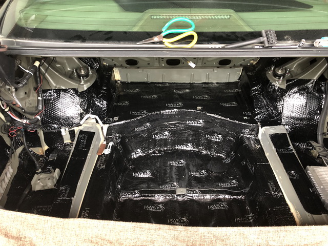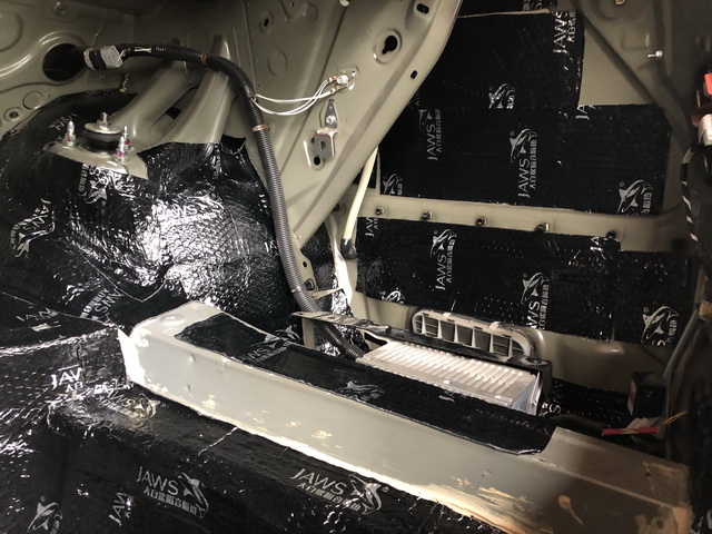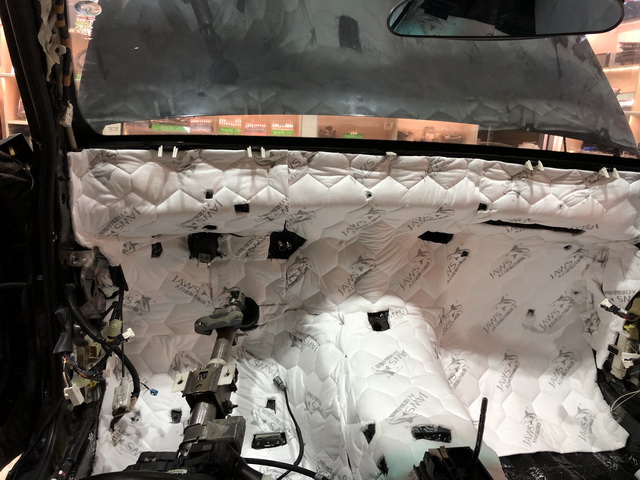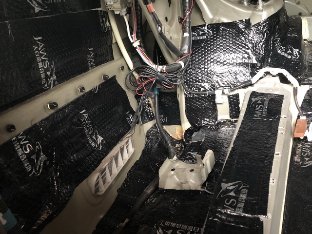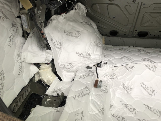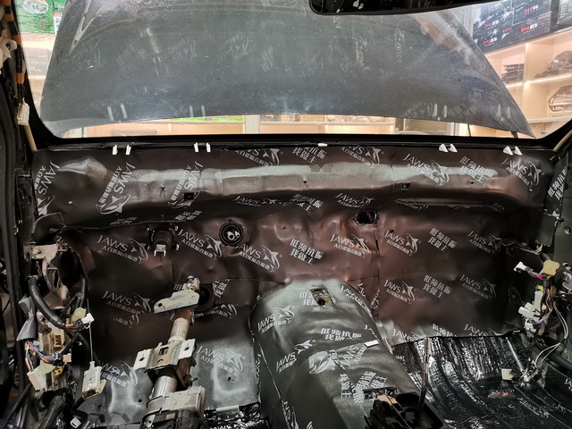 改装技师使用大白鲨隔音减震胶对汽车前半部分进行了隔音处理