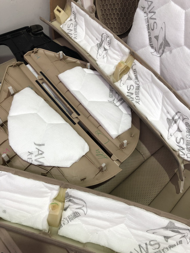 并且在施工中,改装技师发现,车内异味的源头来源于车内老旧的劣质隔音材料,因此,改装技师先对汽车进行了整体的隔音材料拆卸处理,才进行后续的隔音处理工作。