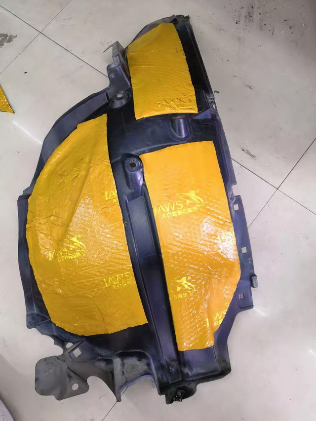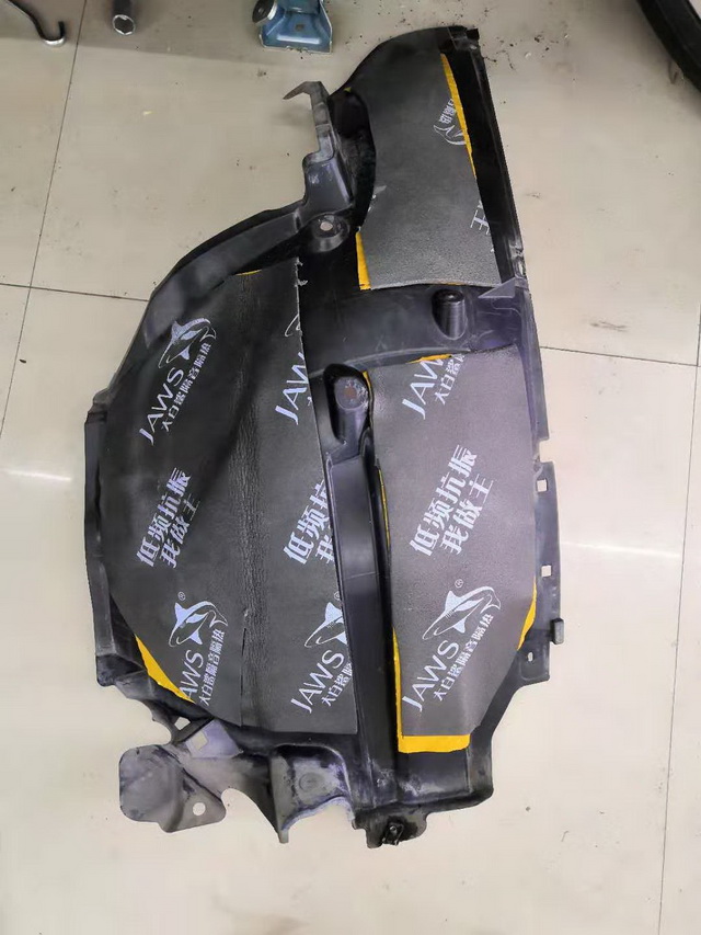 因为原车胎噪的声音也比较大,所以改装师选择用大白鲨黄金甲对汽车轮弧部位进行第一层的隔音处理,接着再使用大白鲨低频王对轮弧进行第二层隔音处理,最后使用白棉进行吸音处理。