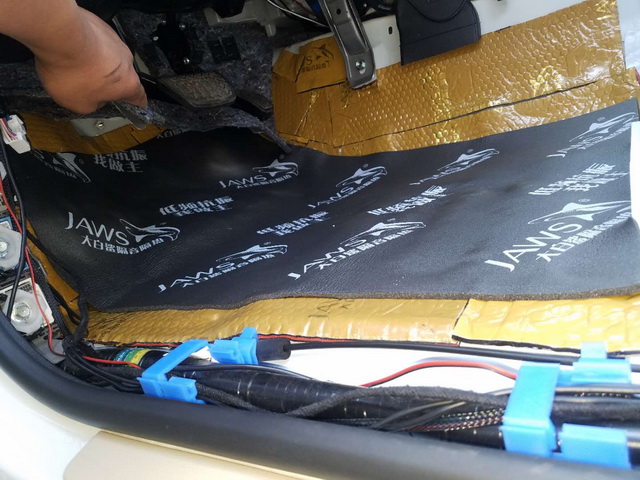 将仪表台下方使用大白鲨白棉进行三层隔音处理