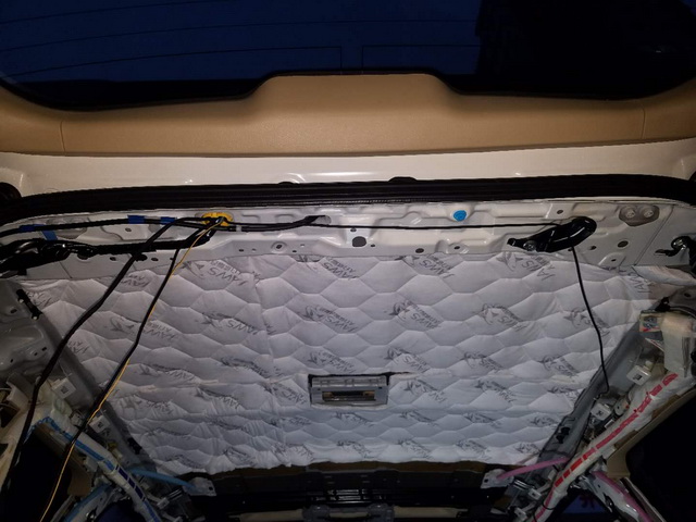 在将底盘部位进行隔音处理的同时,改装师还对汽车轮毂和后备箱部位也进行了隔音处理,后备箱部位本身结构特殊,噪音折射放大现象十分扰人,进行隔音后可以有效减弱噪音干扰,同时轮毂部位的隔音也可以防止胎噪向上传递进内室。同时改装师还将汽车顶棚部位也进行了双层隔音处理。