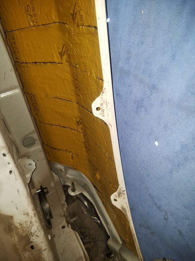 改装师将门板拆卸下来可以看到,内部隔音措施比较简陋,到处可见的孔洞,风噪极易从这些缝隙中侵入内室,改装师使用大白鲨黄金甲对门板进行隔音处理,大白鲨黄金甲由三种高级丁基胶和高韧性铝箔复合而成,具有较强的耐用性,并可以抑制噪音来源。经过隔音的门板关门声也更加厚重了起来。