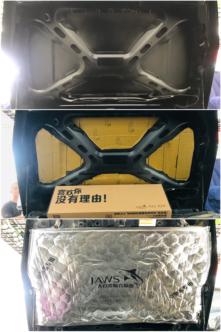 使用JS500和金鲨引擎膜,对引擎盖做隔音和隔热处理