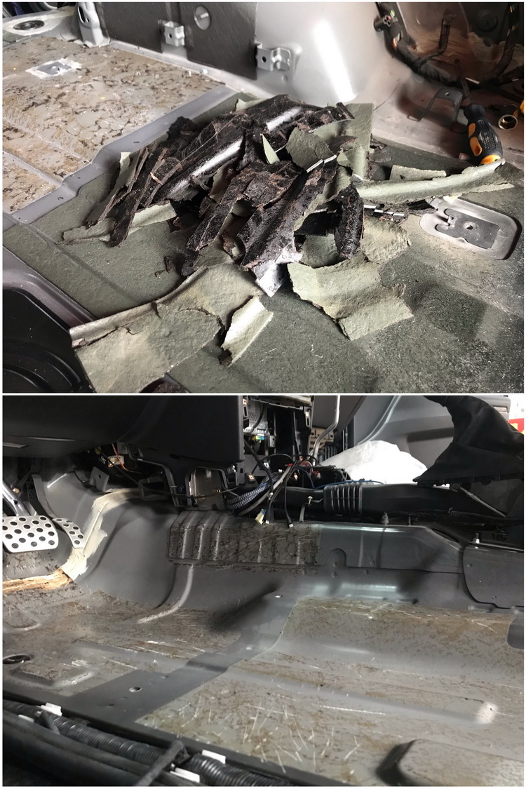 改装技师在熟练的拆除车内座椅等零部件后,在漏出的底盘上能够看到原车底盘上的沥青隔音材料,而且散发着浓浓的刺鼻气味,于是改装技师使用专业的清理工具,认真耐心的将其铲除、清理干净,将异味源头驱除。