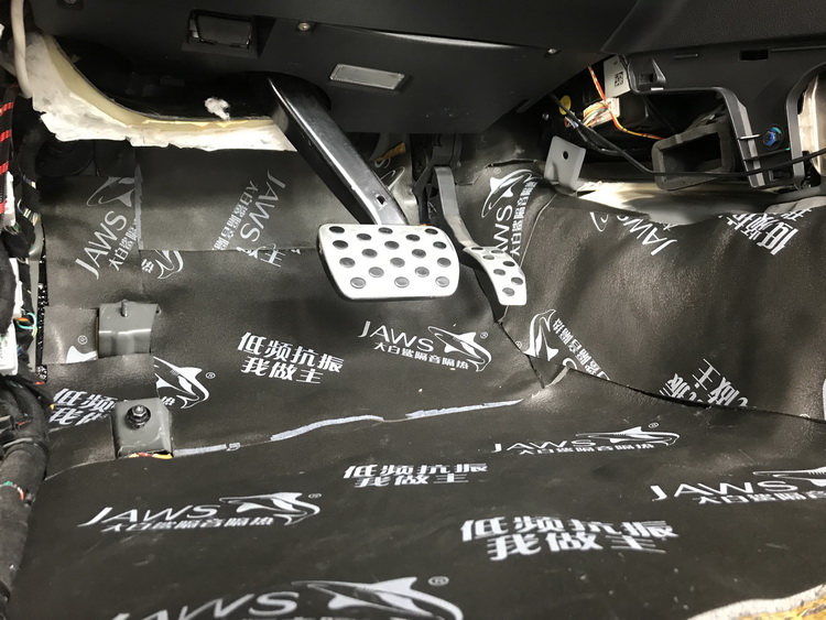 汽车的脚踏板处,不仅会产生振动噪声,同时发动机舱内的噪声,也有可能通过脚踏板处传入到车厢内部。技师使用JS500和银鲨棉,对脚踏板处做双层隔音处理,在减少噪声产生的同时,也阻止了发动机舱内噪声的传入。
