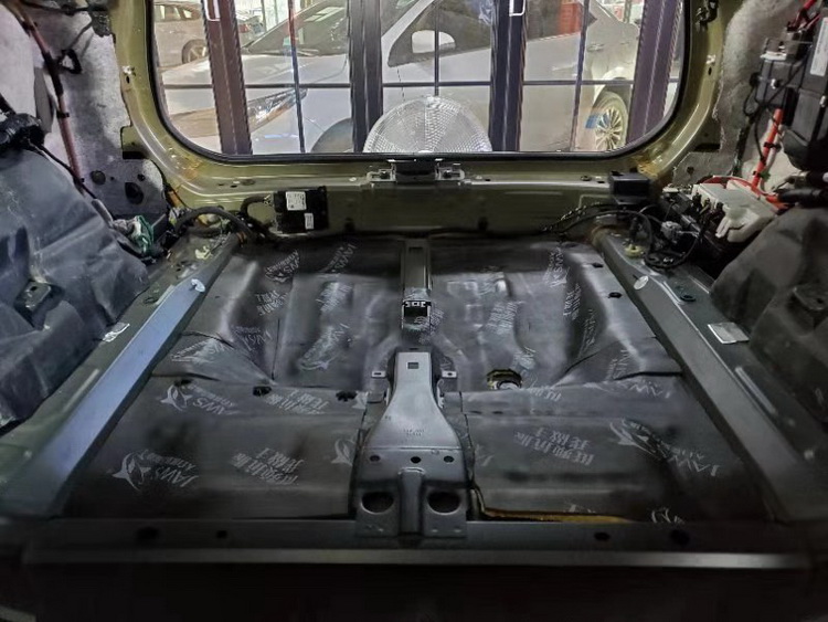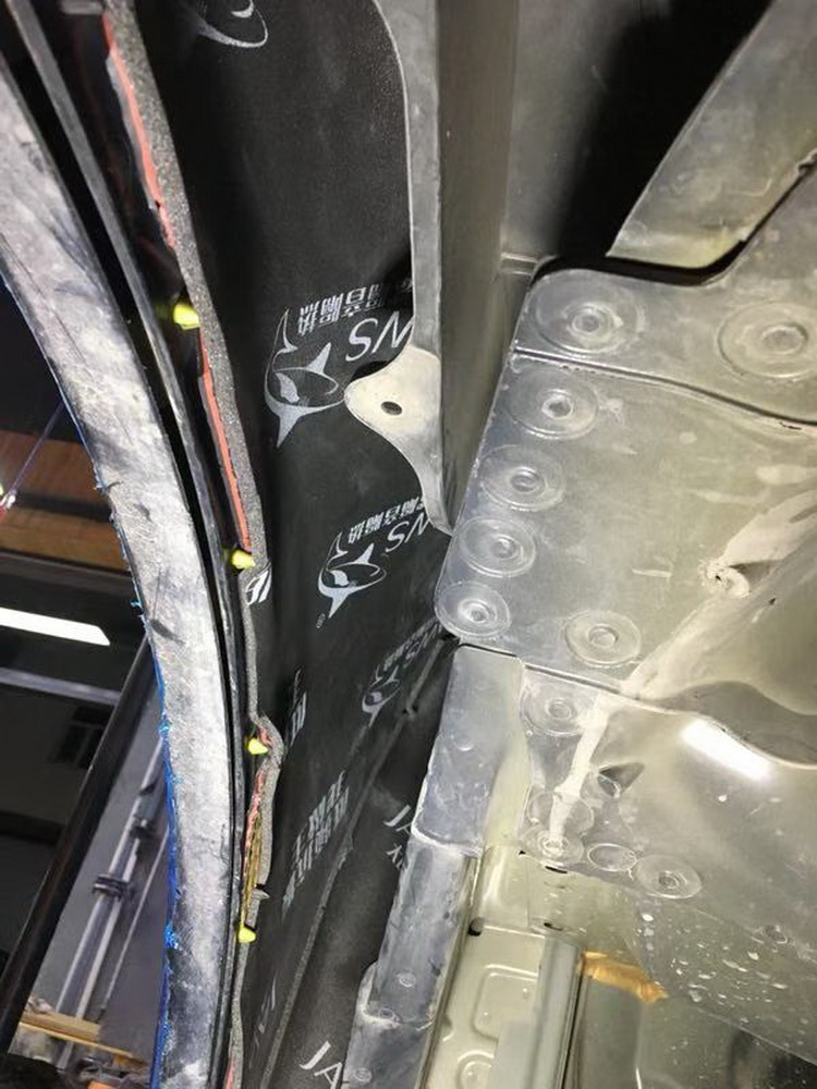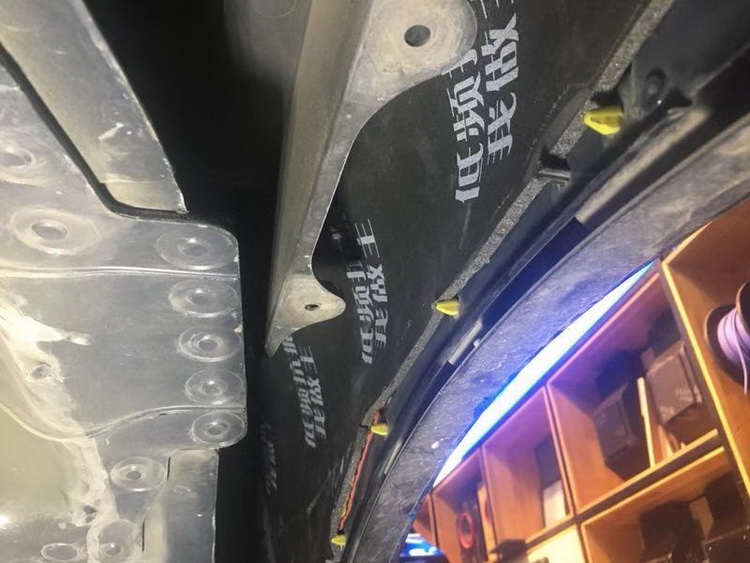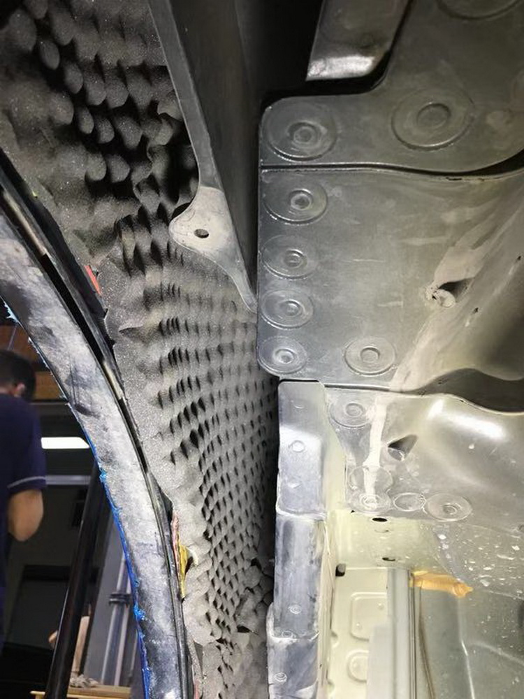 首先进行的是底盘位置的隔音处理,改装技师使用JS500+隔音垫的双层减震处理,强化了底盘钣金的抗震性,并且充分抑制了底盘上的低频共振噪音,通过改装技师展示的施工处理,完美的解决了底盘噪音。