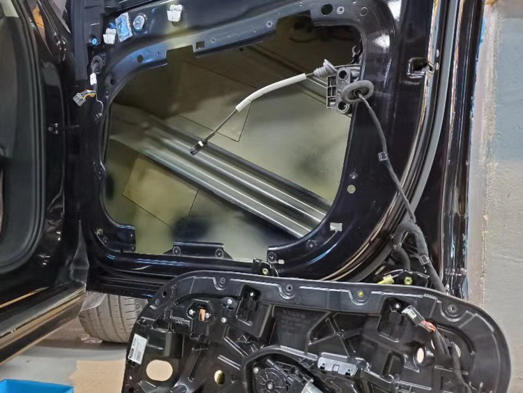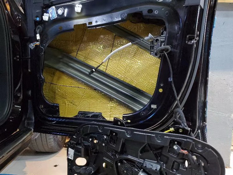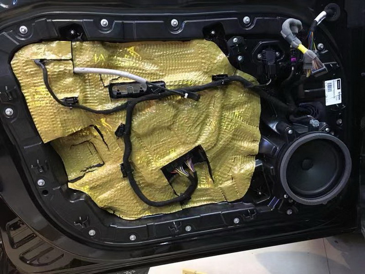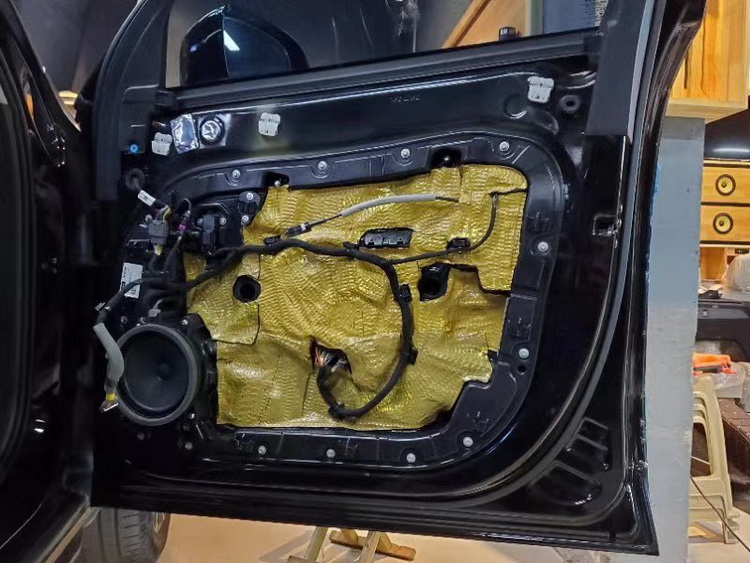 接下来改装技师针对汽车的门板位置,使用JS500对汽车的门板进行了双层的隔音处理,有效的抑制了门板铁皮的振动噪音,并阻隔了风噪噪音,提升了门板的隔音效果,也为喇叭提供了一个良好的工作环境。