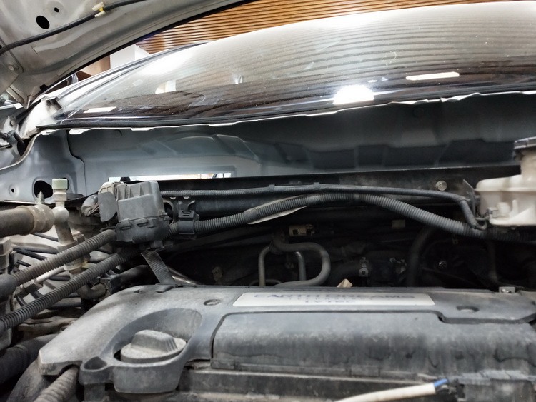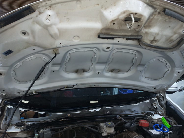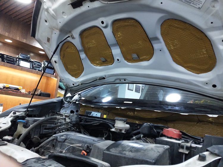 第一步是对发动机噪音的抑制,发动机振动影响到引擎盖机盖铁皮,使其产生振动噪音从水槽位置传入车内,于是改装技师便使用JS300对引擎盖和水槽做隔音处理,强化了钣金的抗振性,抑制了发动机噪音的传递。