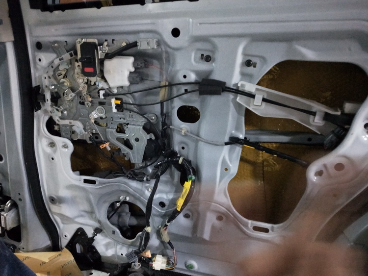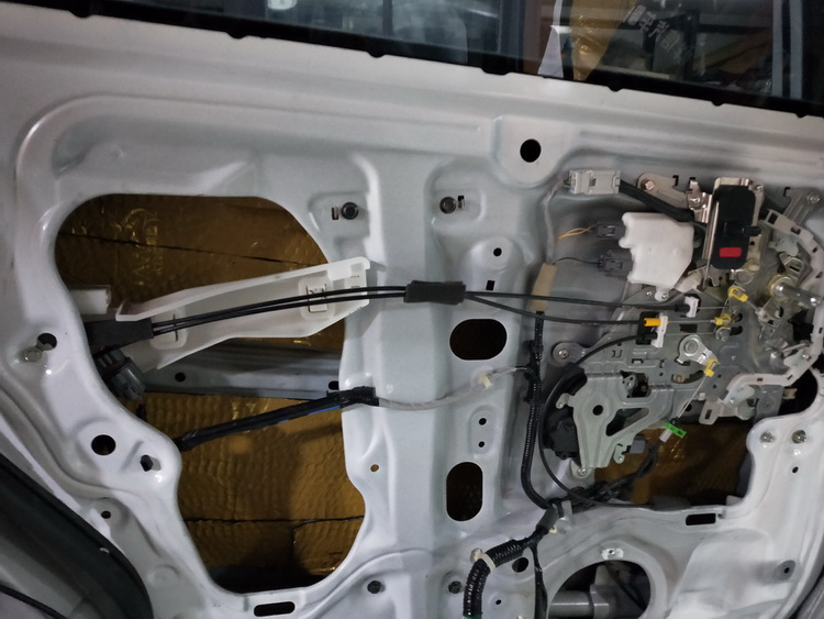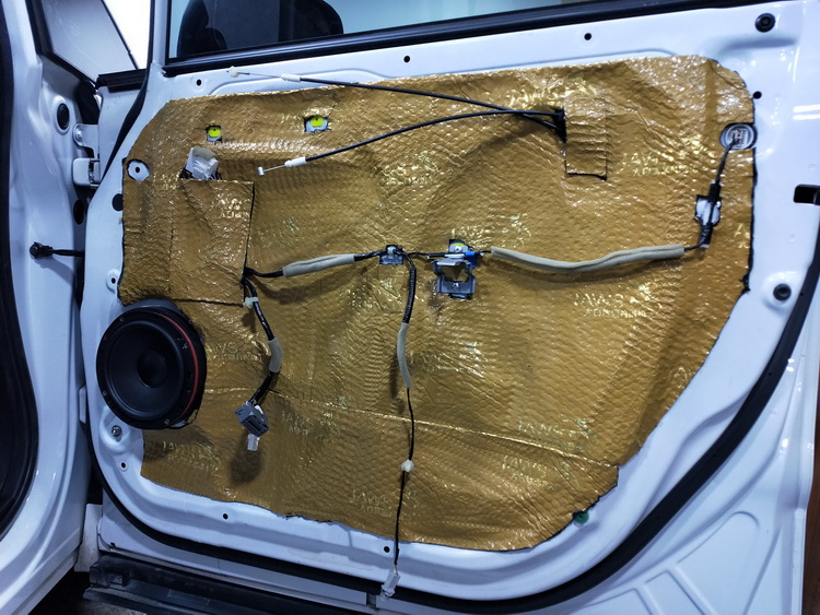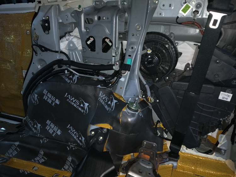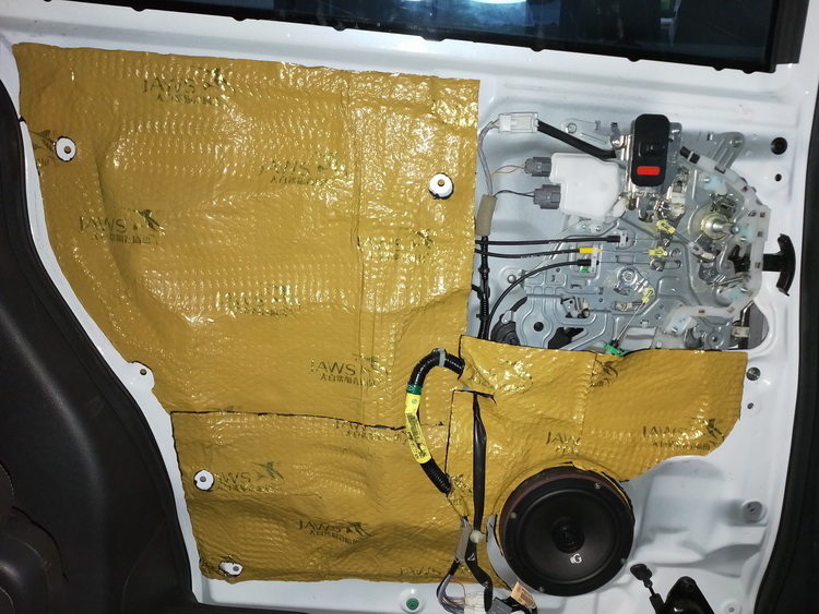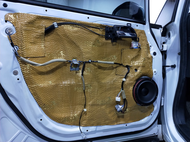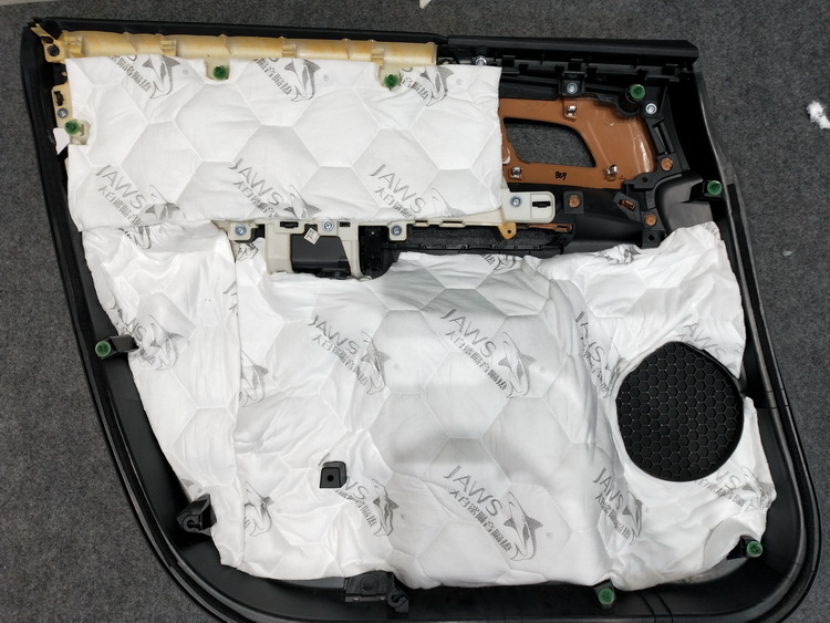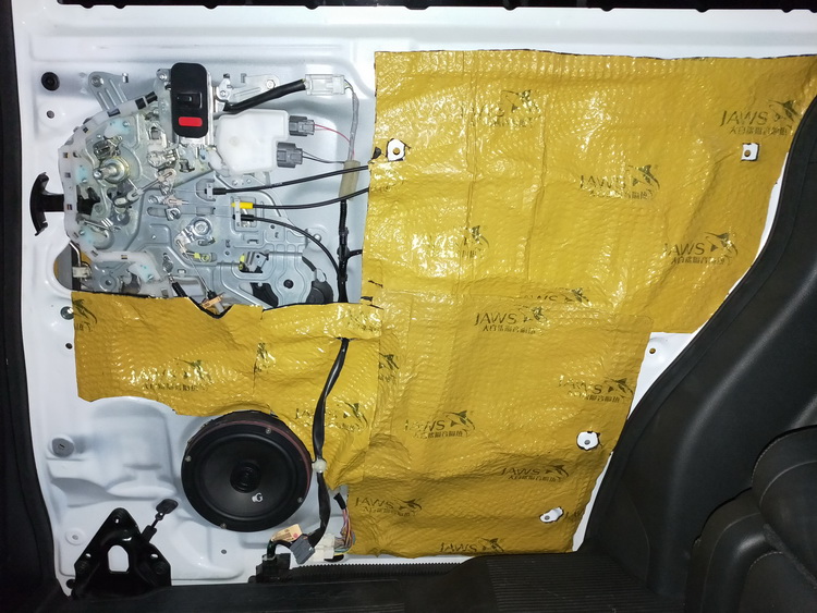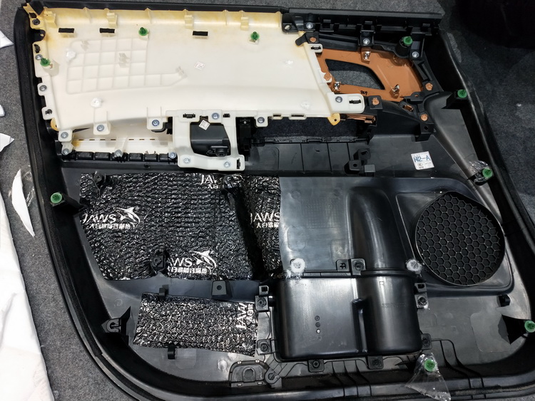 下面的对门板位置做隔音升级,使用JS300对门板进行双层隔音处理,将内侧、框架贴合紧密,有效的抑制了门板振动,并且将门板包裹严密,组织了风噪入侵,最后再对门板内饰盖做双层隔音处理,进一步消除了门板的噪音。