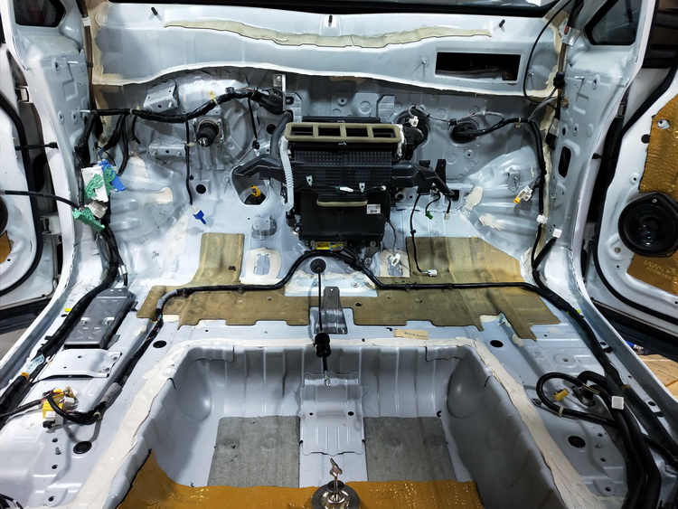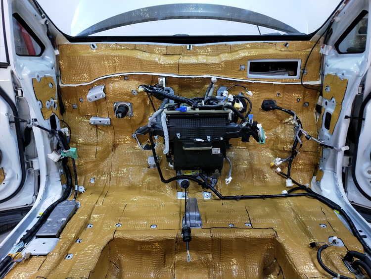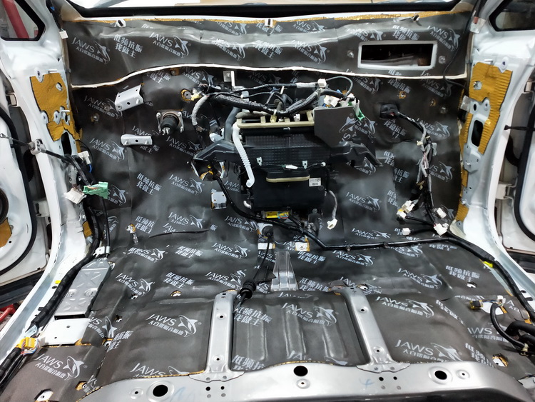 由于原车的防火墙隔音措施极为欠缺,导致发动机舱的噪音毫无阻隔的传入车厢内,对此改装技师使用JS300+隔音垫的双层止振,有效的抑制了低频共振噪音,再使用高弹波浪棉做第三层隔音处理,进一步隔绝噪音并隔绝了发动机舱的热量传递。