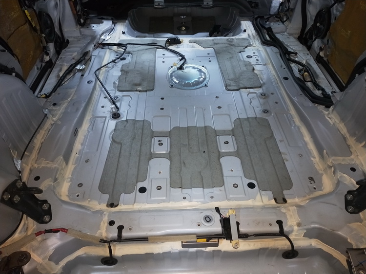 底盘和尾箱的部分相连,由一整块宽大且单薄的铁板构成,在汽车行驶时产生了较大的低频共振噪音,对此,改装技师使用JS300强化钣金的厚度、硬度,再使用隔音垫抑制低频噪音,最后使用消音棉进一步消除噪音,净化了底盘、尾箱的噪音。