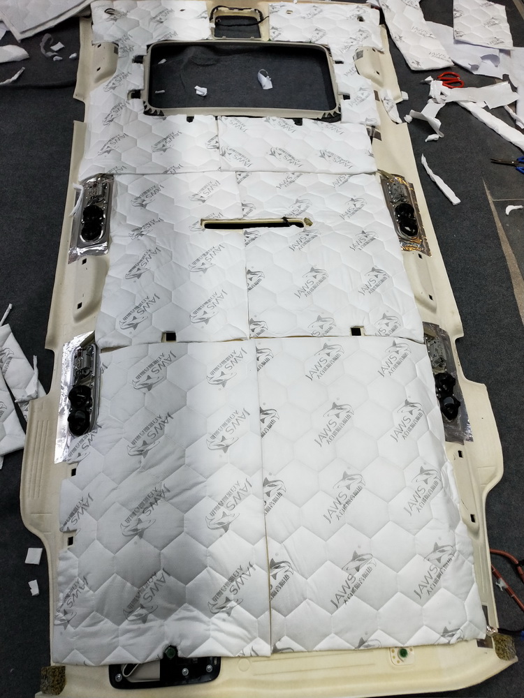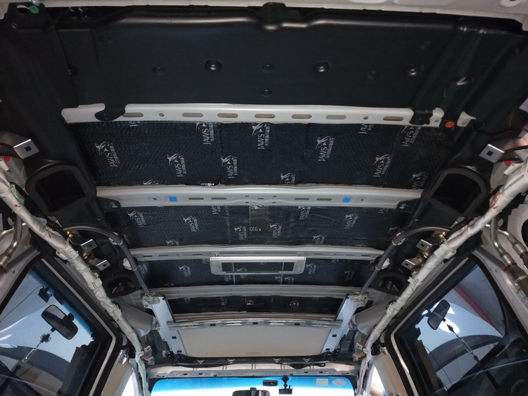 与底部相对应的汽车顶棚,同样是振动噪音的噪音源头,对此技师使用银鲨止振、消音棉隔音的双层隔音,对顶棚和顶棚内饰盖进行了紧密的隔音处理,隔绝了噪音的同时也隔绝了来自顶棚日晒的热量。