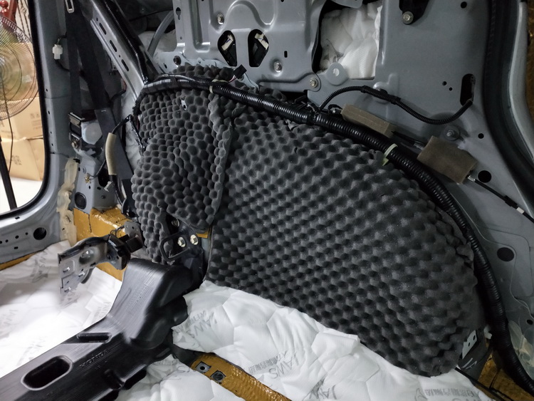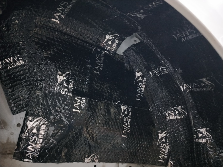 最后处理的是胎噪噪音,首先是对外部的汽车轮弧使用JS300+隔音垫做双层止振隔音处理,对叶子板使用JS300+消音棉做双层隔音处理,从外部抑制胎噪噪音的形成和进入,再对内部的轮毂使用JS300+隔音垫+高弹波浪棉做三层隔音处理,抑制并隔绝胎噪噪音的进入,最后再使用银鲨+消音棉对后门板内饰盖做双层隔音处理,进一步隔绝胎噪噪音的影响。