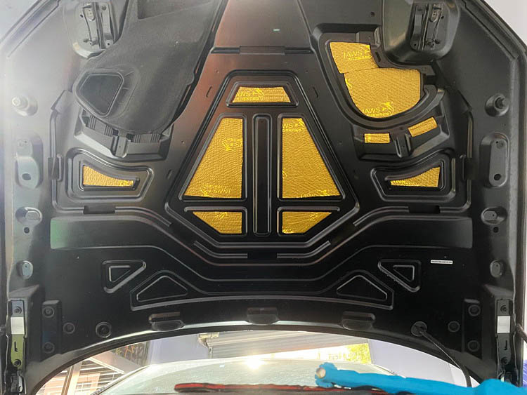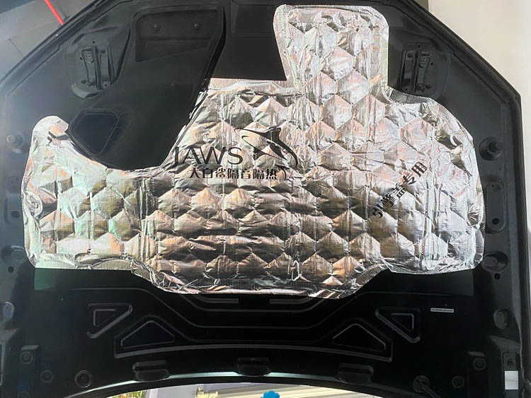 作为发动机舱内的主要噪声源头之一,原车引擎盖位置几乎没有任何的隔音措施。对此,技师首先使用金鲨JS500对机盖做第一层止振处理,强化了钣金的抗振性、抑制了噪音的传递。再使用引擎盖棉做第二层隔热处理,降低发动机热量对引擎盖漆面的影响。