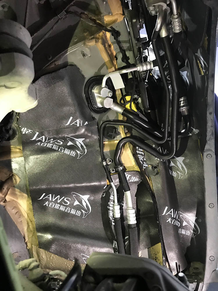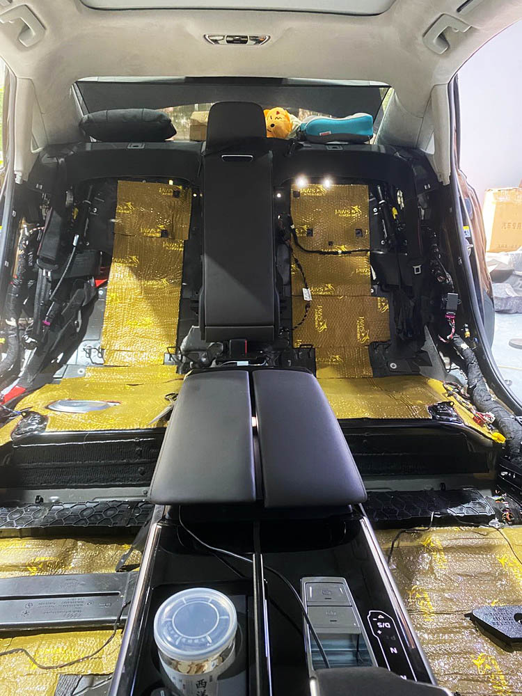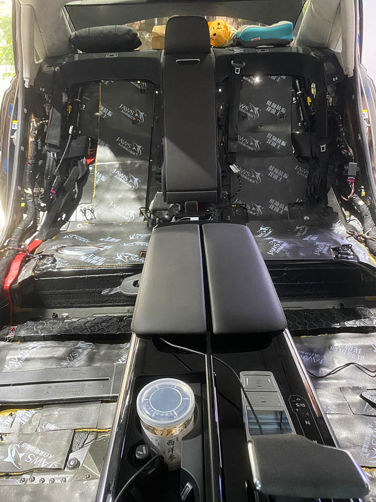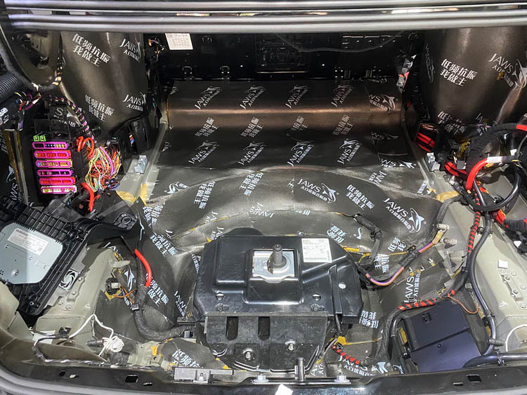 原车底盘未作任何隔音处理,导致底盘处低频共鸣噪声比较明显。技师先使用金鲨JS500对底盘做第一层全面止振处理,降低低频共振噪声的产生;再使用隔音垫对底盘做隔音处理,隔断噪声的传播;最后使用银鲨棉对底盘做吸音处理,吸收底盘的各类噪声。