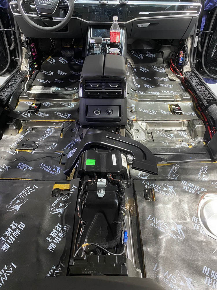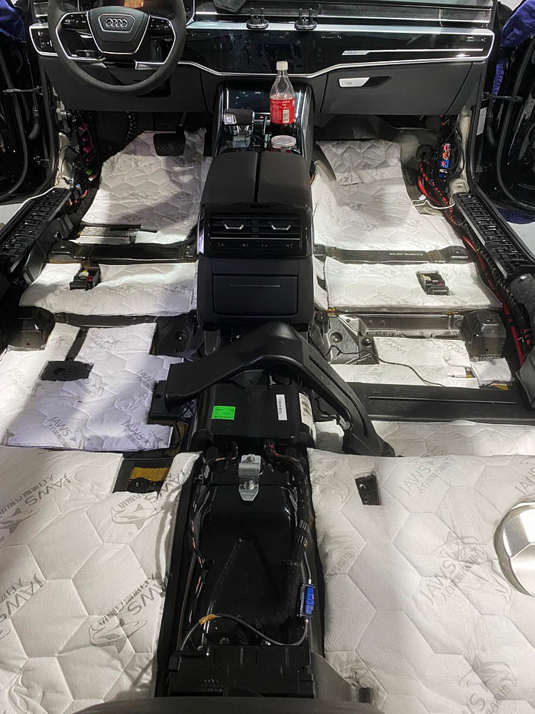 【隔音效果点评】全面扎实的隔音施工,将大白鲨隔音材料的隔音效果充分展现,有效的抑制了这台奥迪A8的行车噪音,车主试车后也非常满意,对大白鲨隔音材料的品质非常认可。