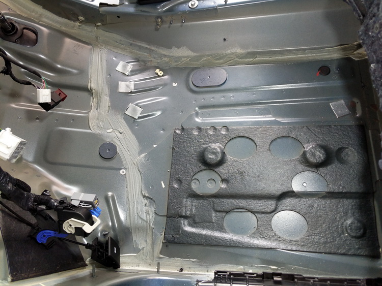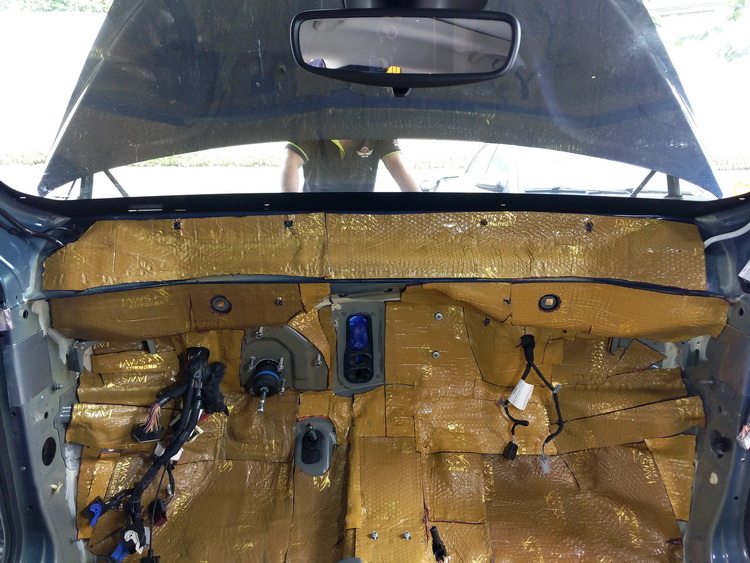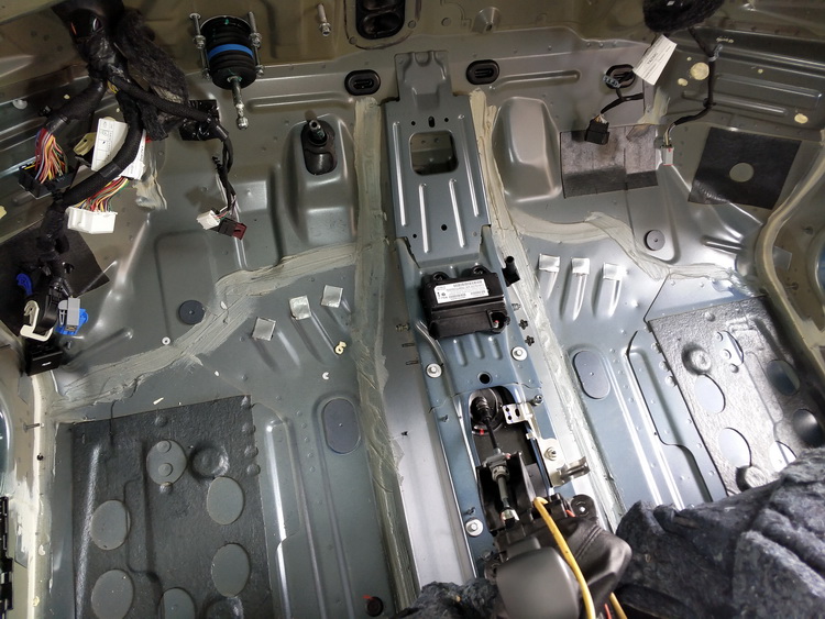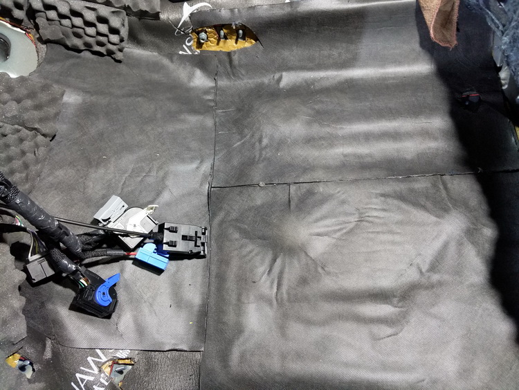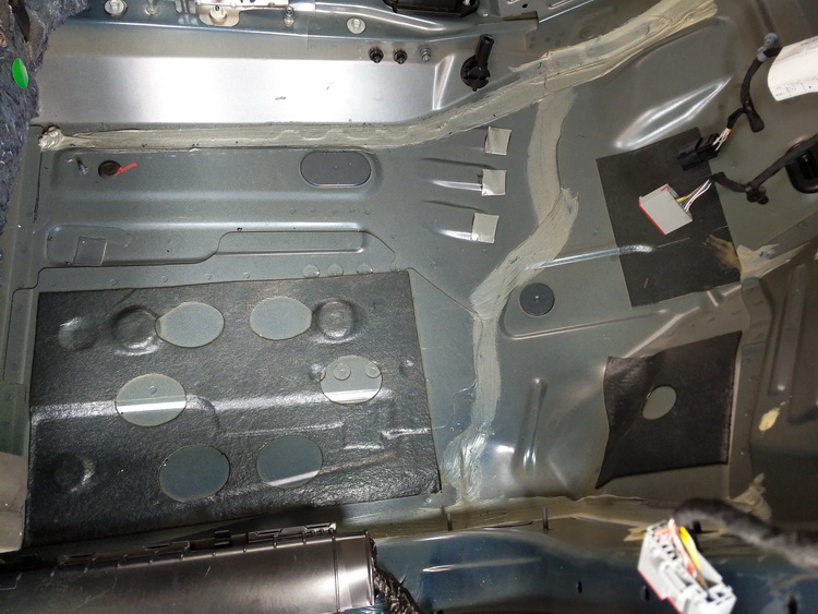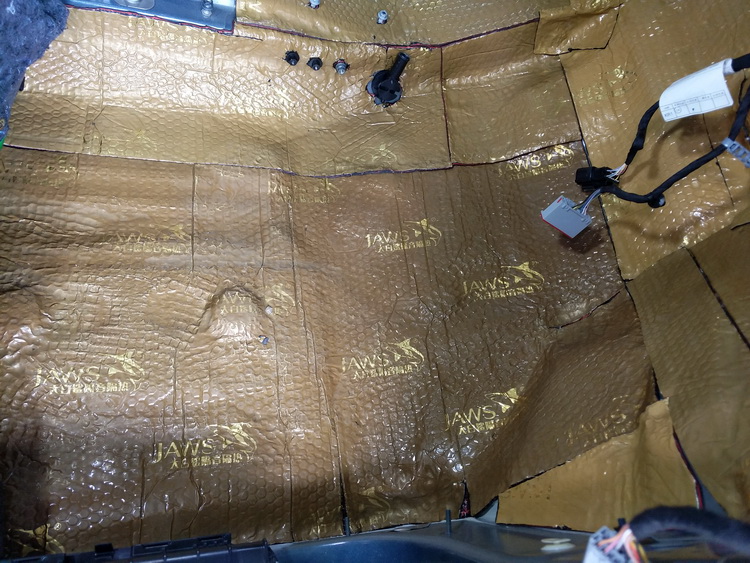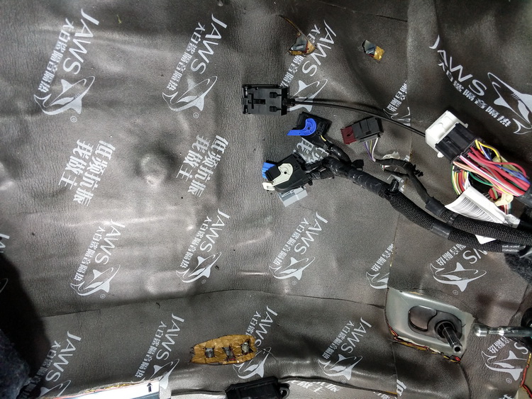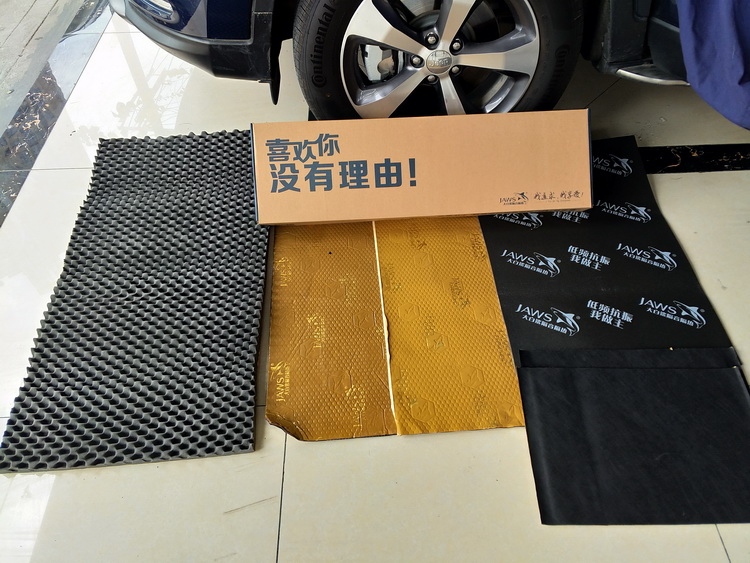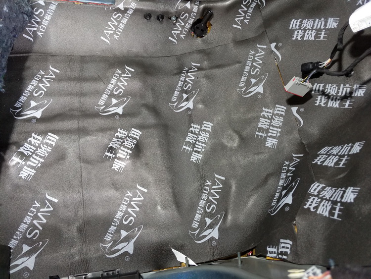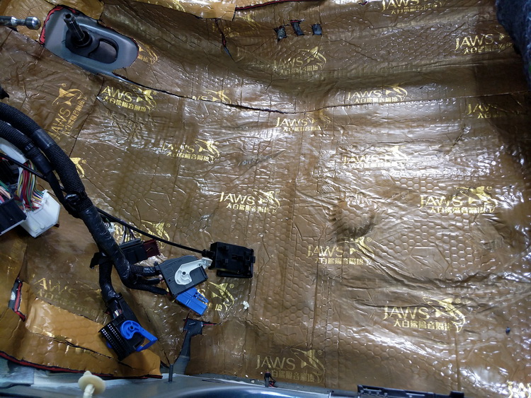 最后,在汽车的脚踏位,针对受到胎噪影响产生的严重低频共振噪音,技师使用金鲨JS500做第一层止振处理,强化班金抗振性,再使用隔音垫做第二层隔音处理,能隔绝低频共振的传入,最后,技师使用静静1号做第三层隔音处理,能够将残余的共振、低频噪音进一步吸收、隔绝,解决脚踏位的低频共振噪音。