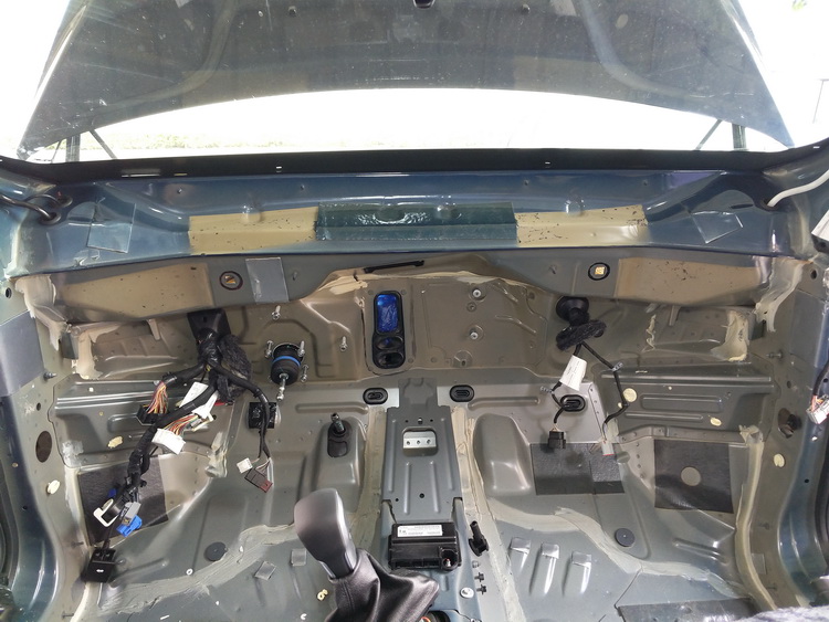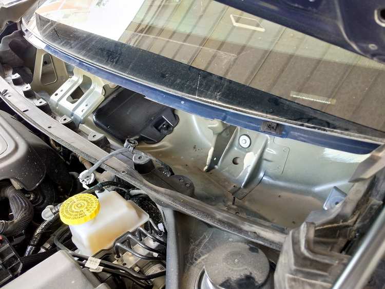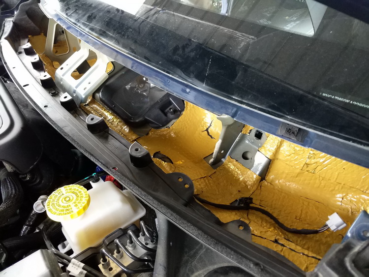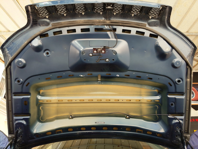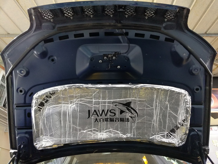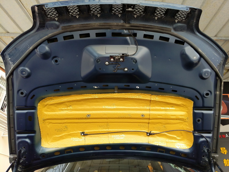 首先是在汽车的引擎盖位置,原车的引擎盖基本是光秃秃的钣金直接面对引擎,受到共振影响,将噪音传入车内。对此,技师使用金鲨JS500做第一层止振处理,紧贴在引擎盖位置,能够增强钣金抗振性、抑制共振噪音。再使用引擎盖棉做第二层隔音处理,可以进一步消除发动机噪音对钣金的共振影响。并且技师还对水槽位置,使用金鲨JS300进行了隔音升级,从路径上也起到了有效的隔绝发动机噪音传入车内的作用。
