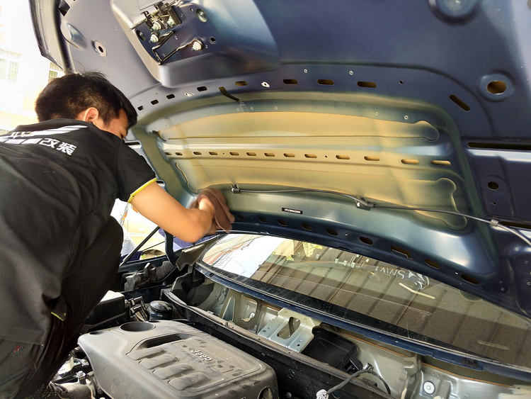 【对症下药-噪音的解决方案】根据车主的诉求,改装技师对这台JEEP进行了行车噪音的检测与分析,通过对噪音的定位,改装技师根据噪音源头与大小,决定对汽车的引擎盖、水槽、防火墙、脚踏位,使用大白鲨汽车隔音产品做针对性的隔音升级。