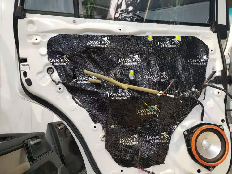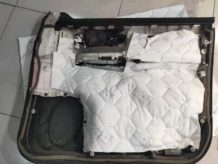 作为风噪噪音的源头,门板钣金受到风噪影响后,还会产生严重的共振噪音。对此,技师选用止振效果出色的银鲨减震胶,对门板的内外两侧做双层止振处理,可以有效的抑制钣金共振,而将门板包裹严密的处理方式,更是很好的阻隔了风噪的传入。之后,技师还使用银鲨棉对门板内饰进行了隔音处理,进一步消除了门板双层止振后残余的噪音。