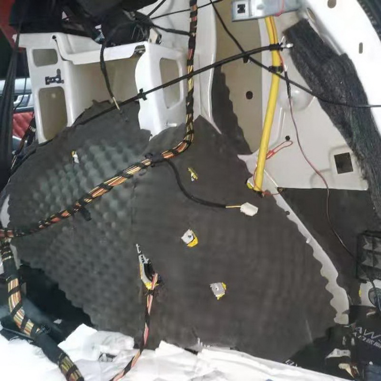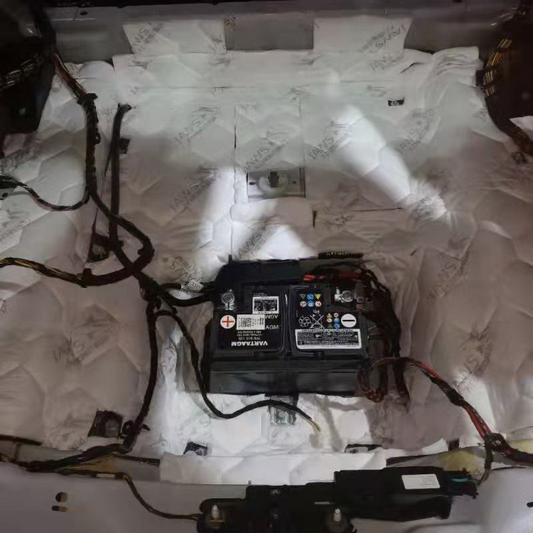 原车的后备箱是一个空腔结构,汽车行驶时后备箱会产生空腔共鸣,所以技师在使用黑金减震胶和隔音垫,对后备箱做完止振处理之后,又特意使用银鲨棉对后备箱做了吸音处理,通过三层隔音处理,减少了后备箱内噪声的产生和传播。