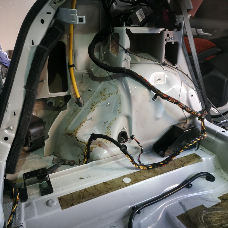 拆掉底盘和脚踏位的饰板以后,一股恶臭扑面而来,这就是车厢内异味的来源。技师将原车已经老化的沥青减震胶铲除,从根源上消除了异味的产生。然后先使用黑金减震胶,对底盘和脚踏位做全面的止振处理,以降低低频共振噪声的产生;再使用隔音垫做第二层隔音处理,能够更好的隔断低频共振噪音的传播;最后,使用银鲨棉对脚踏位和底盘做第三层隔音处理,可以将残余噪音进一步吸收、消除。其中脚踏位的全面隔音处理,也能够在一定程度上,阻止发动机舱内噪声的传入。
