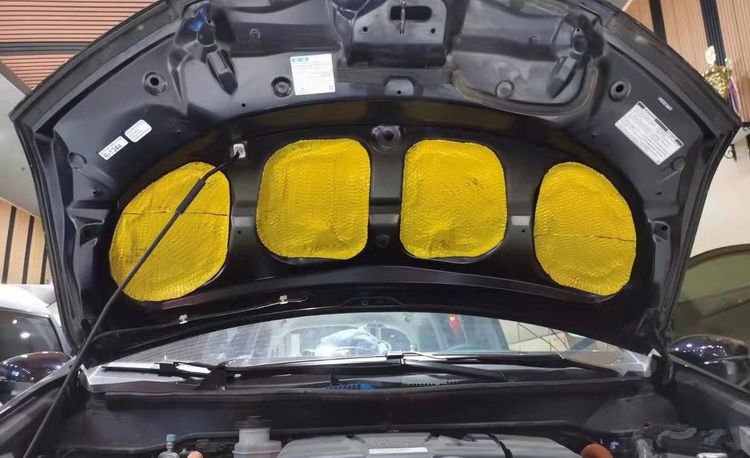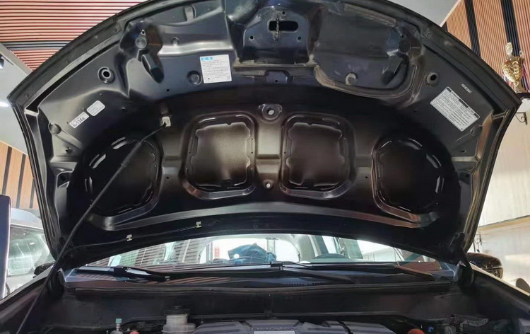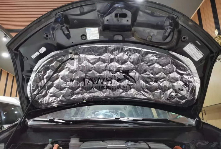 原车的引擎盖不仅容易产生共振,发动机工作产生的热量也会通过引擎盖传入到车厢内部。所以技师在使用金鲨JS300对引擎盖做了第一层止振处理之后,又使用引擎盖棉对引擎盖做了第二层隔热处理,从而对引擎盖漆面起到了一定的保护作用。