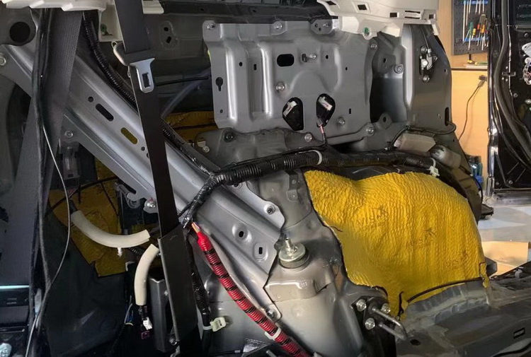 底盘是低频共振的重灾区,但原车底盘仅在重点部位有几块简单的止振板,难以起到良好隔音效果。因此技师先使用金鲨JS300做第一层止振处理,增强钣金抗振性、抑制共振噪音;再使用隔音垫做第二层隔音处理,可以有效的隔绝低频共振噪音的传播;最后,再使用银鲨棉对底盘做第三层隔音处理,能够将前两层过滤后残余噪音吸收并隔绝。