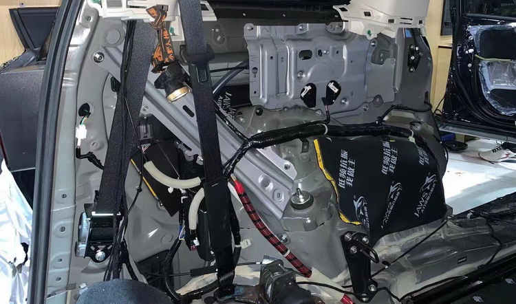 汽车在行驶时产生的路噪和胎噪,主要通过叶子板传入到车厢内部,所以技师在使用金鲨JS300,对轮弧内叶子板做了止振处理之后,又使用隔音垫和银鲨棉,对轮弧内叶子板做了隔音和吸音处理,从而切断了路噪和胎噪的传播途径。为了阻止风噪的传入,技师使用金鲨JS300,对门板也做了隔音处理。