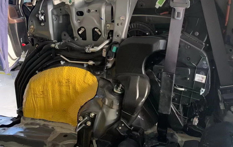 经过道路实测,技师发现原车的噪声十分明显,在低速行驶时,噪声主要以低频共振为主,随着车速提高,风噪、路噪以及发动机舱内的噪声也传了进来。因此车主使用环保耐用的大白鲨汽车隔音产品,对汽车的底盘、轮弧内叶子板、脚踏位、引擎盖、门板、后备箱做了隔音处理。