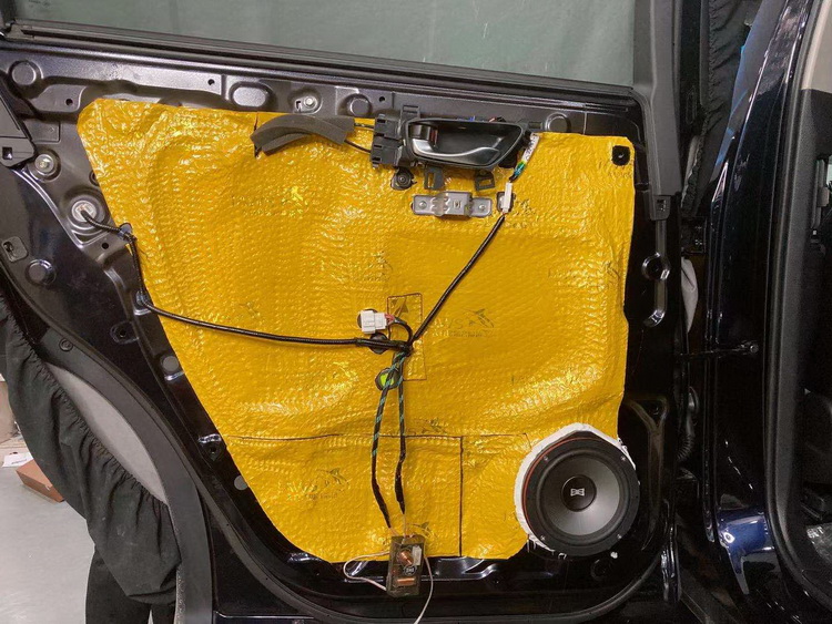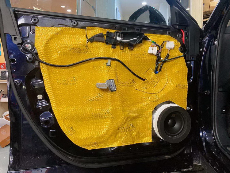 在门板位置,技师使用金鲨JS300对门板的内外进行了双层止振处理,通过严谨的施工,将门板严密包裹。这样既能阻隔风噪的传入,也抑制了门板钣金的共振噪音。