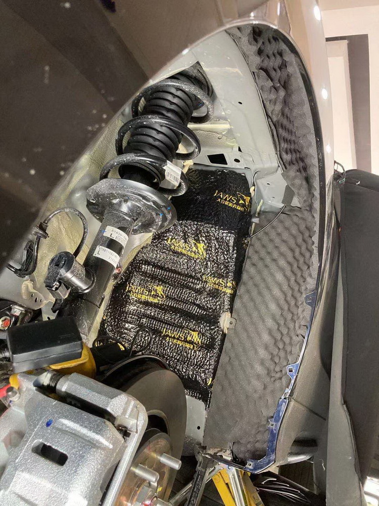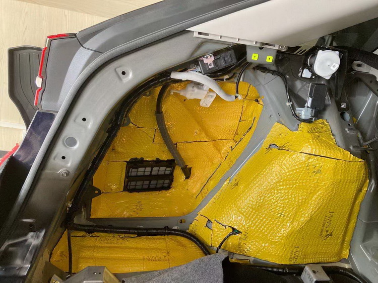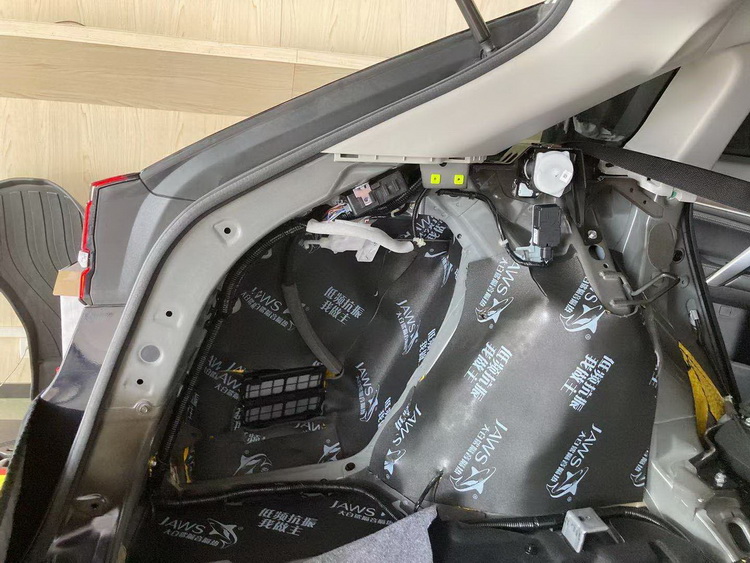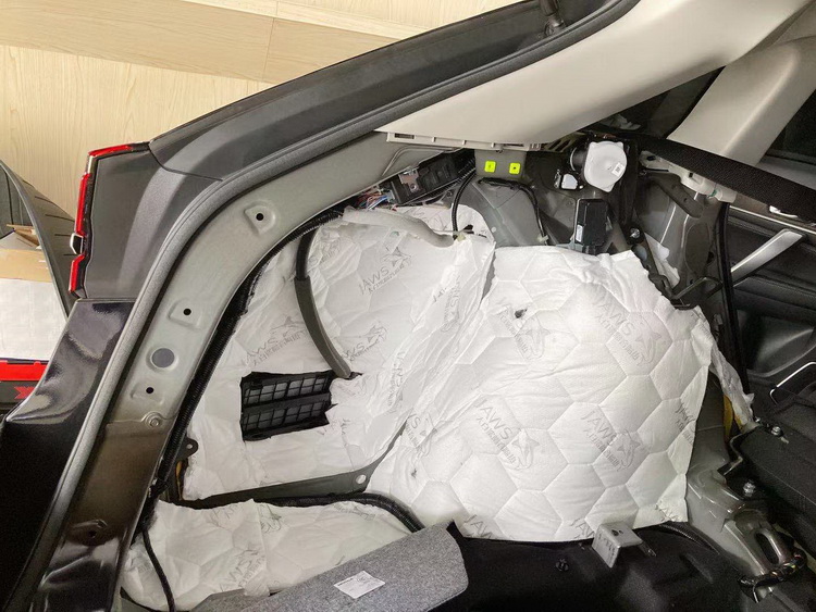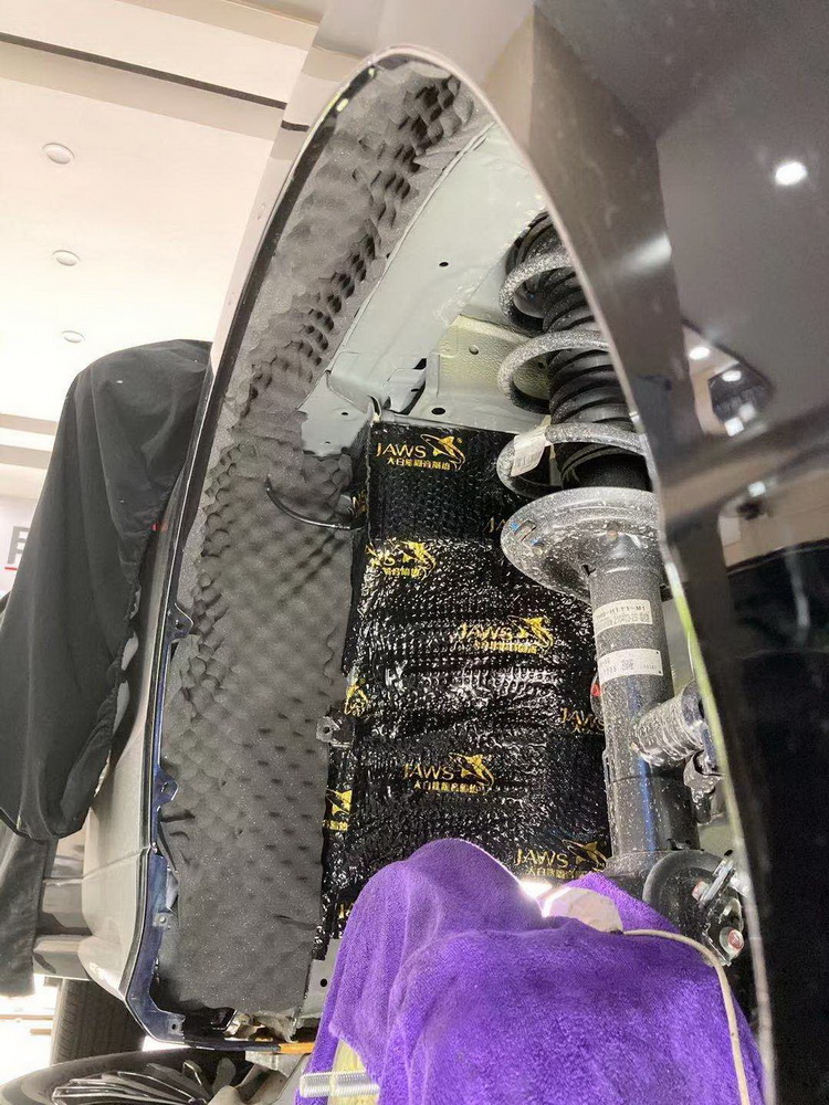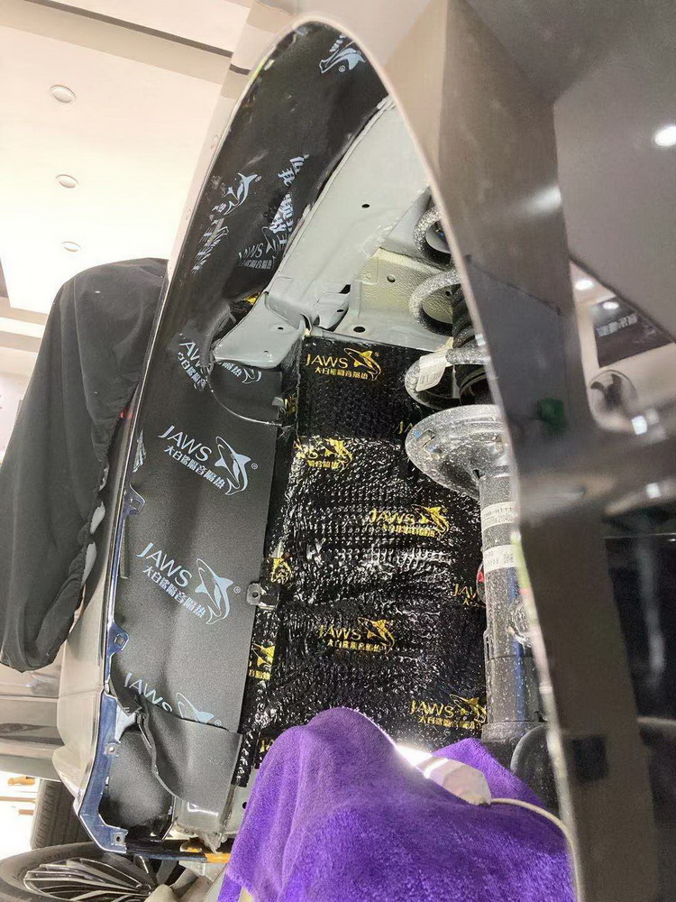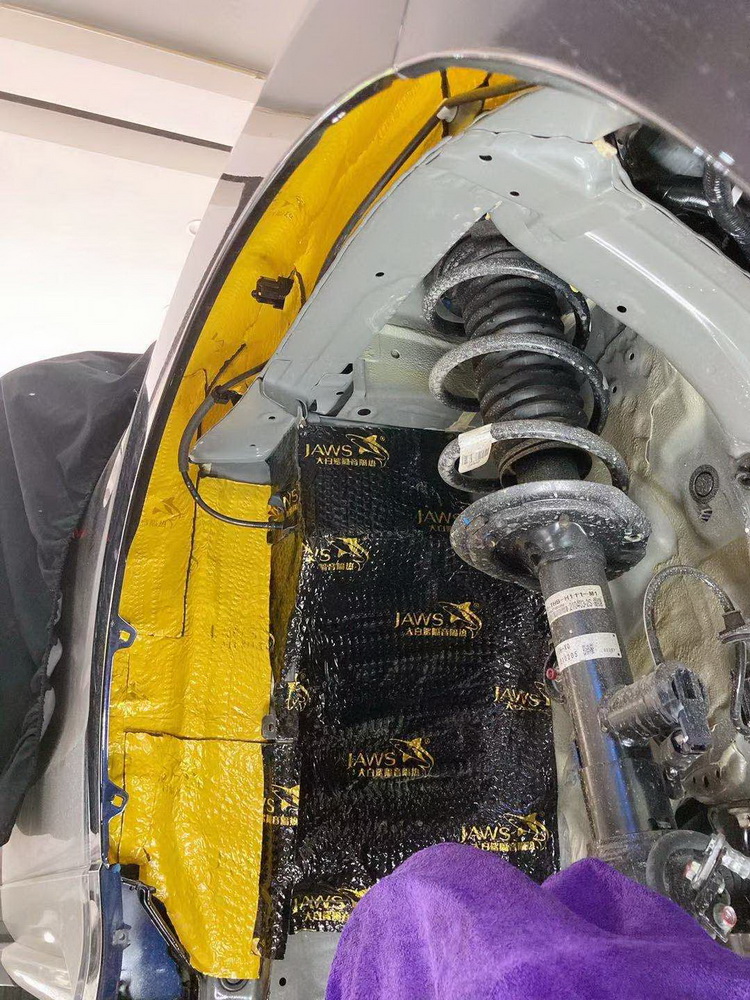 在胎噪源头的轮弧位置,技师使用金鲨JS300、黑金减震胶对轮弧做第一层止振处理,使用隔音垫做第二层隔音处理,并使用高弹棉做第三层吸音处理。再对轮弧衬板位置,使用金鲨JS300、银鲨棉做双层隔音处理。有效的抑制了胎噪传入车内,更提升了车内隔音措施的降噪效果。