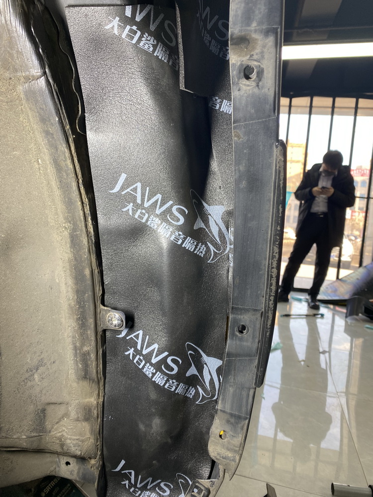 经过检测,技师发现目前车厢内较为明显的噪声有空腔共鸣、路噪、胎噪几种,因此技师使用大白鲨系列隔音材料,对汽车的后备箱、轮弧和内叶子板,做了针对性的隔音处理。