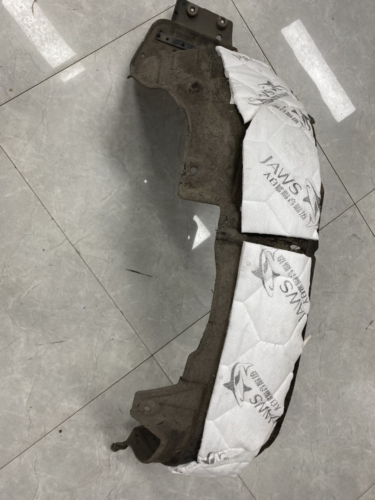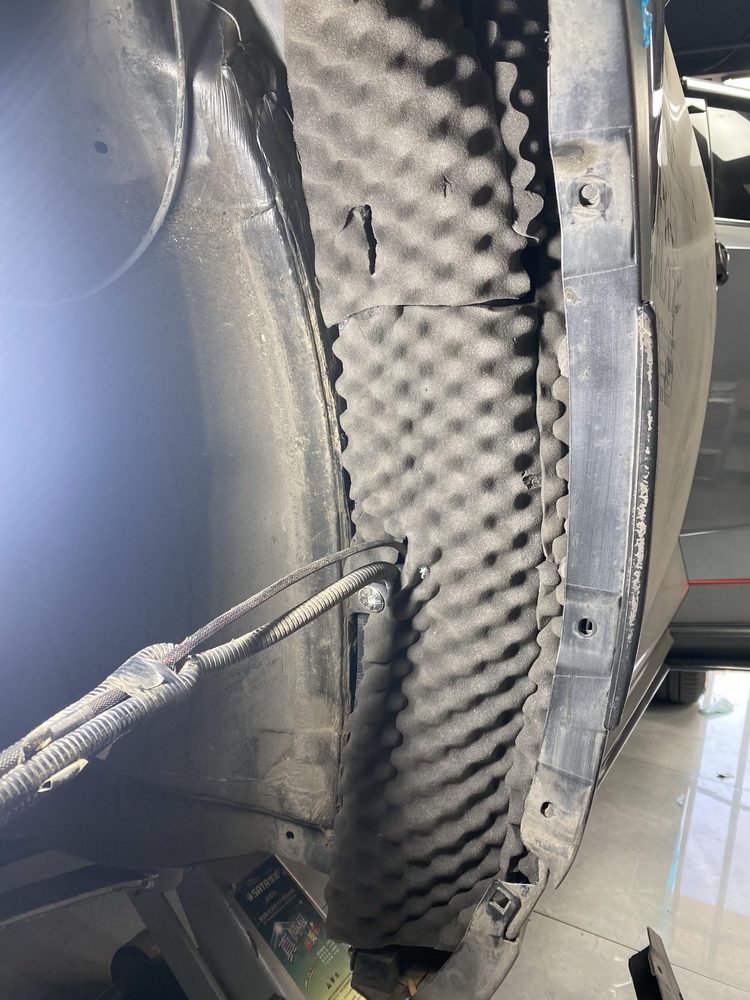 轮弧处是路噪和胎噪的主要传入路径,但原车在该部位并未做有效隔音处理。技师先使用金鲨JS300对轮弧处做止振处理,再使用隔音垫和高弹棉对轮弧做隔音和吸音处理。而拆卸下来的轮弧衬板,则使用银鲨棉做吸音处理,这就阻断了路噪和胎噪的传播路径,将路噪和胎噪阻挡在了车厢之外。