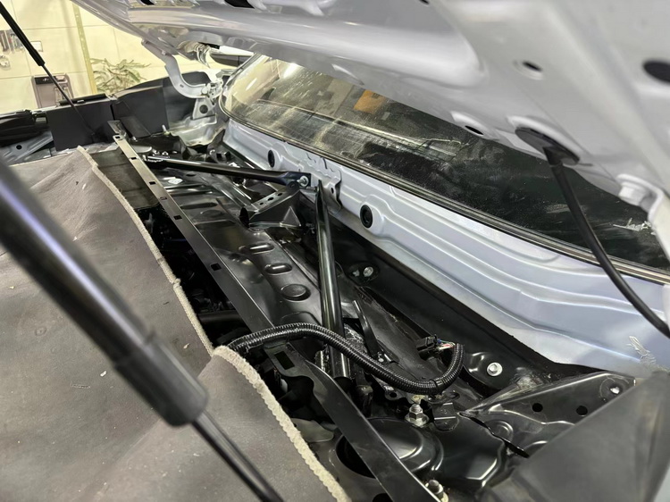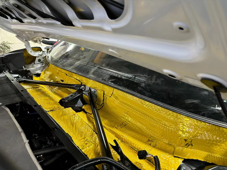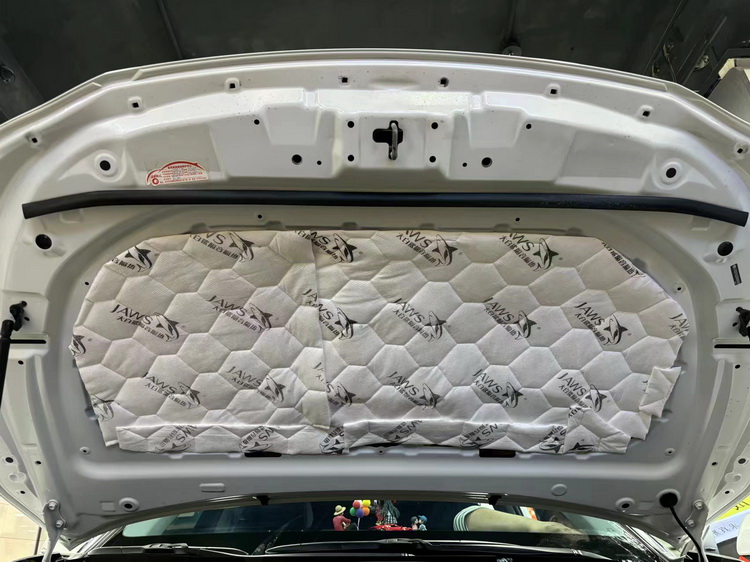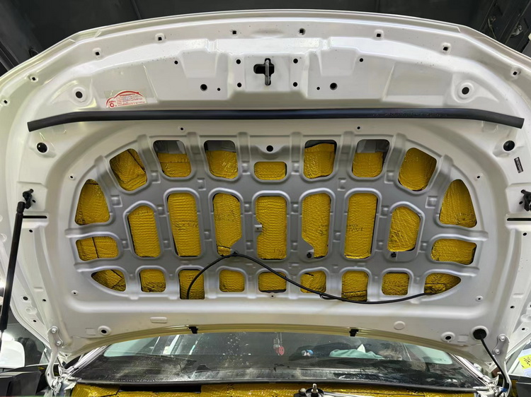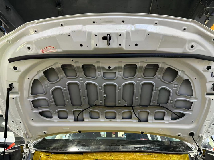 原车引擎盖只是一层铁皮结构,汽车行驶时引擎盖部位很容易产生振动噪声,所以技师先使用金鲨JS300对引擎盖做了止振处理,减少了该部位的低频共振,又使用银鲨棉对引擎盖做了吸音处理,增强了该部位的隔音效果。