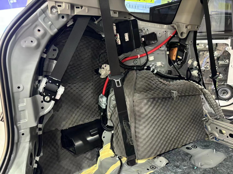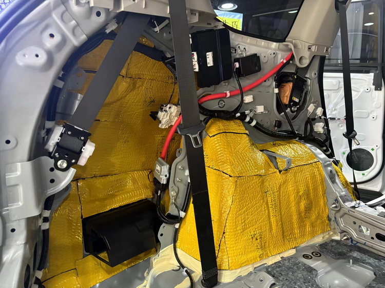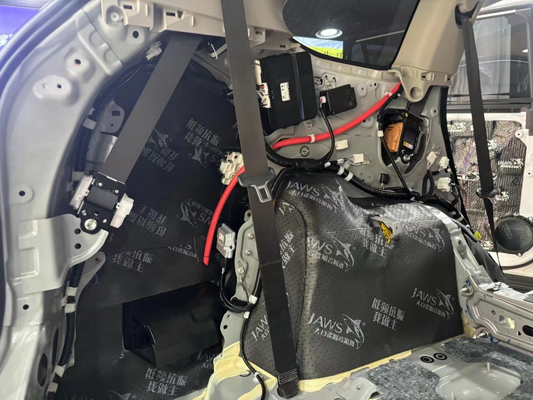 汽车行驶产生的路噪和胎噪,主要通过前叶子板和后轮毂传入到车厢内部。所以技师先使用金鲨JS300对前叶子板和后轮毂做了止振处理,减少了钣金共振的产生;又使用隔音垫对前叶子板和后轮毂做了隔音处理;增强该部位的密封性;最后使用高弹棉对前叶子板和后轮毂做吸音处理,充分保证隔音的效果。