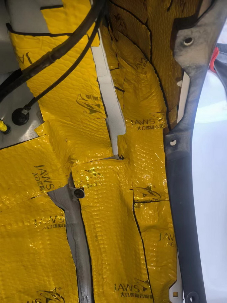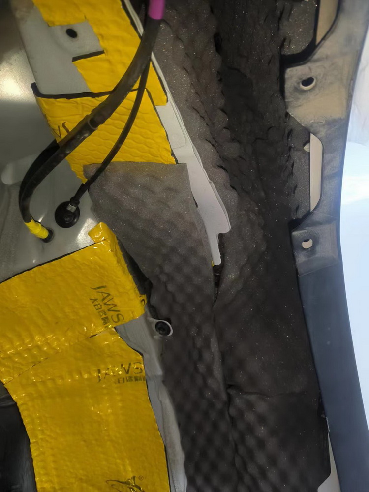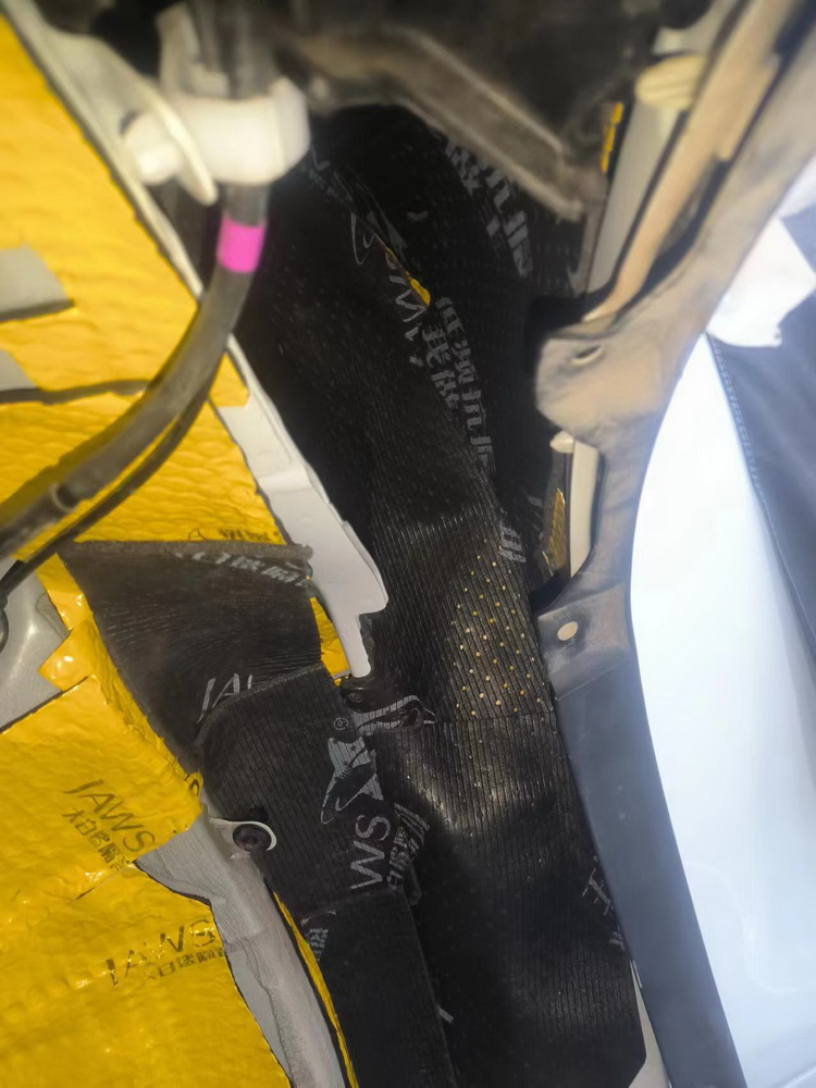 经过道路实测,技师发现原车的噪声主要有来自发动机舱的噪声以及路噪、胎噪两大类,因此技师使用大白鲨系列隔音材料,对汽车的引擎盖、水槽、前叶子板和后轮毂,做了针对性的隔音处理。