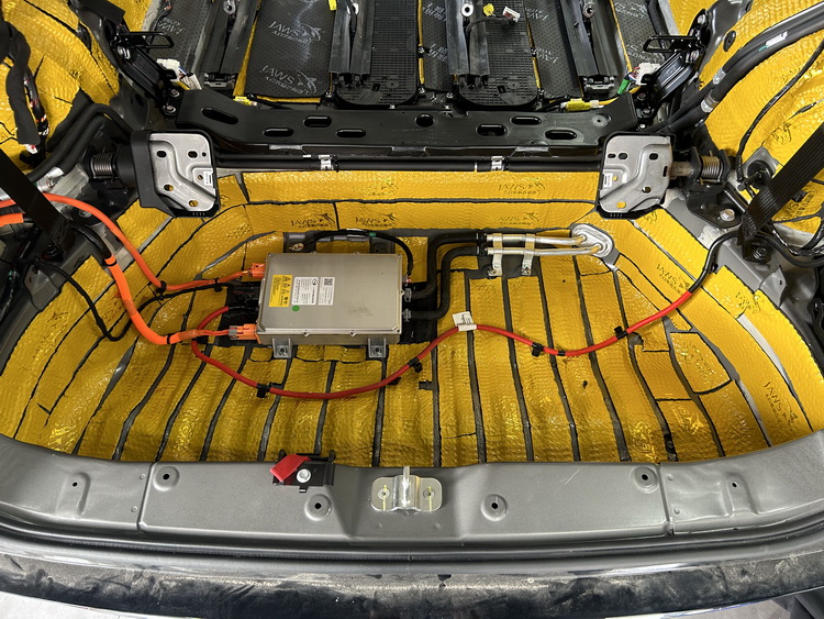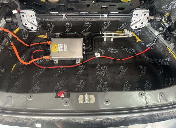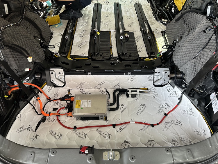 底盘和尾箱是低频共振的主要产生部位,技师先使用金鲨JS300对底盘和尾箱做止振处理,降低低频共振的产生;再使用隔音垫对底盘和尾箱做隔音处理,减少噪声的传播;最后使用银鲨棉对底盘和尾箱做吸音处理,将残余的噪声进行吸收,充分保证隔音的效果。