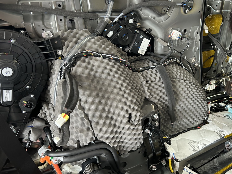 经过道路实测,技师发现原车的噪声主要有风噪、低频共振两种。因此技师使用大白鲨系列隔音材料,对汽车的四门、底盘、尾箱和引擎盖等部位,做了针对性的隔音处理。