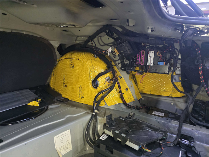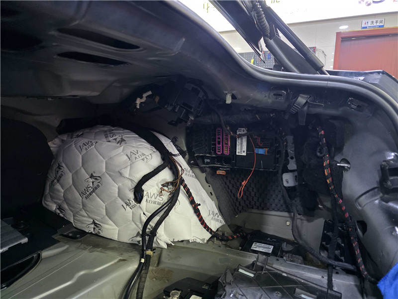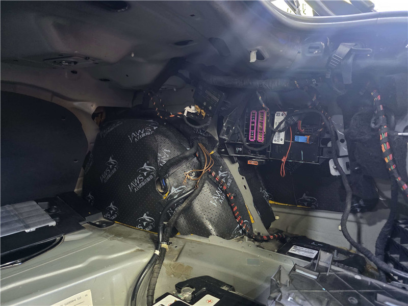 底盘是低频共振的主要产生部位,技师先使用金鲨JS300对底盘做止振处理,减少低频共振的产生;再使用隔音垫对底盘做隔音处理,减少噪声传播;最后使用银鲨棉对底盘做吸音处理,将残余噪声进行吸收,让隔音效果更加理想。