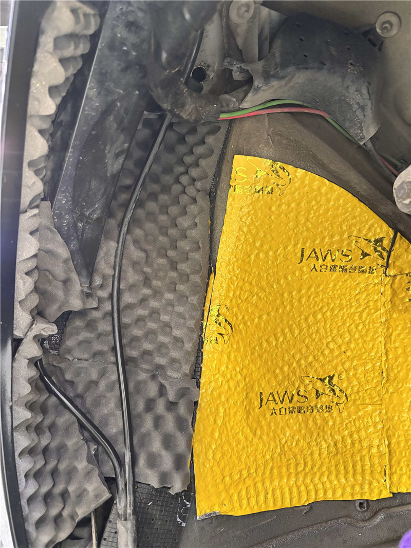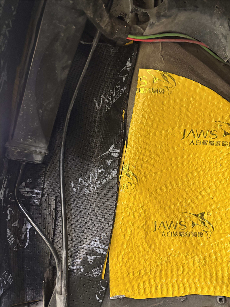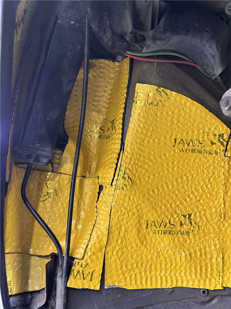 轮胎与地面摩擦会产生路噪和胎噪,此类噪声会通过前叶子板和后轮毂传入到车厢内部。技师在使用金鲨JS300对前叶子板和后轮毂做了止振处理后,又使用隔音垫和银鲨棉,对前叶子板和后轮毂做了隔音和吸音处理,多层的施工,阻止了大部分路噪和胎噪的传入。