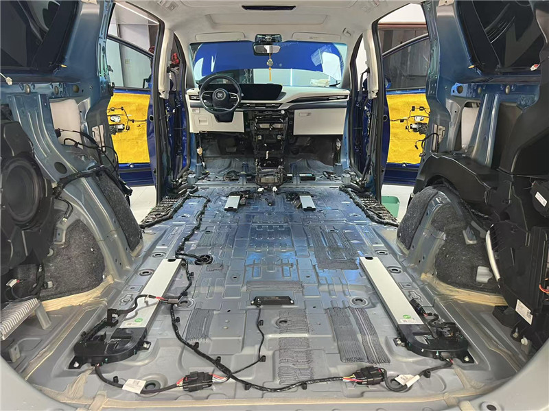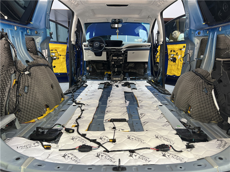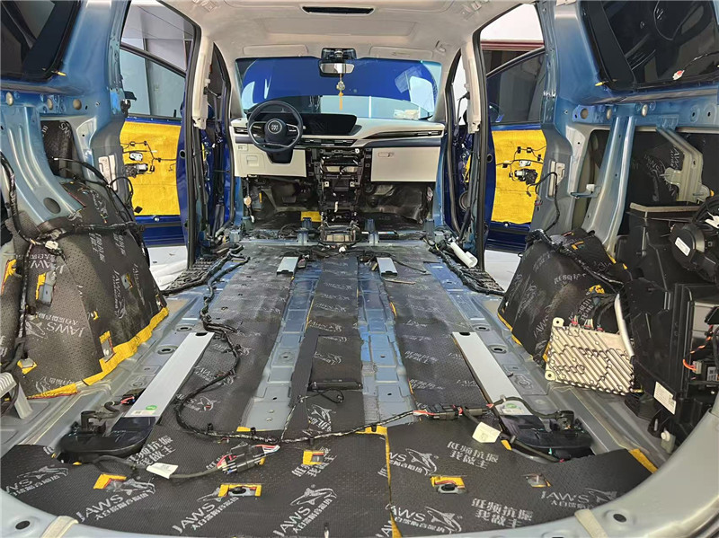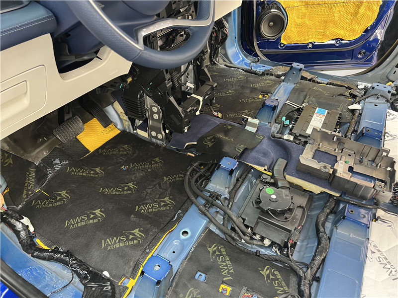 经过检测,技师发现原车的噪声既有自身产生的低频共振,也有外界传入的风噪、路噪和胎噪,因此技师使用大白鲨系列隔音材料,对汽车的四门、底盘和后轮毂,做了针对性的隔音处理。