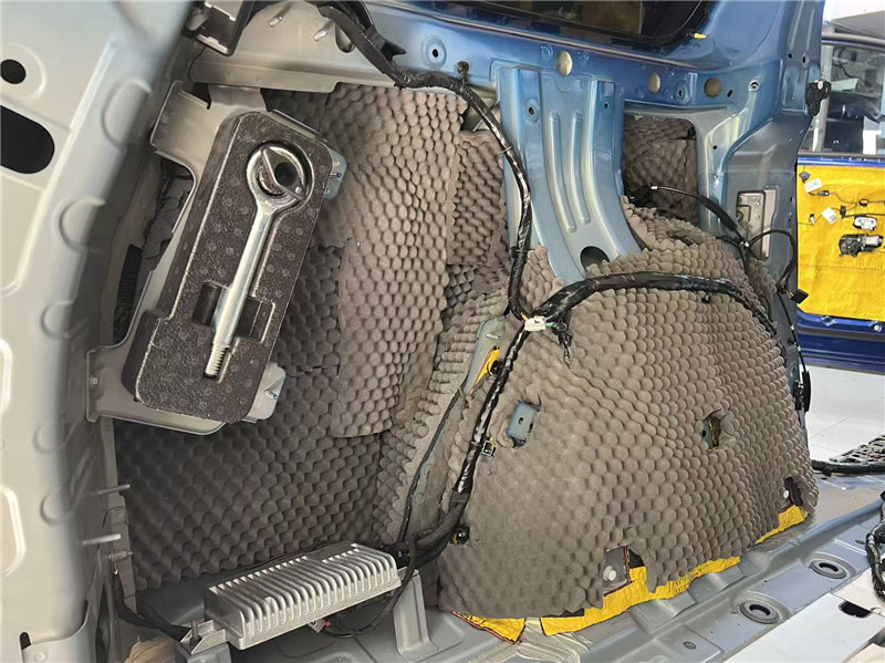 底盘是低频共振的重灾区,而后轮毂处则是路噪和胎噪的主要传入路径之一。技师先使用金鲨JS300对底盘和后轮毂做全面止振处理,从根源上解决低频共振的产生;再使用隔音垫对底盘和后轮毂做隔音处理,减少噪声的传播;最后使用银鲨棉对底盘做吸音处理,而后轮毂处则特意使用高弹棉做吸音处理,将残余的各类噪声进行吸收,让隔音效果更加理想。