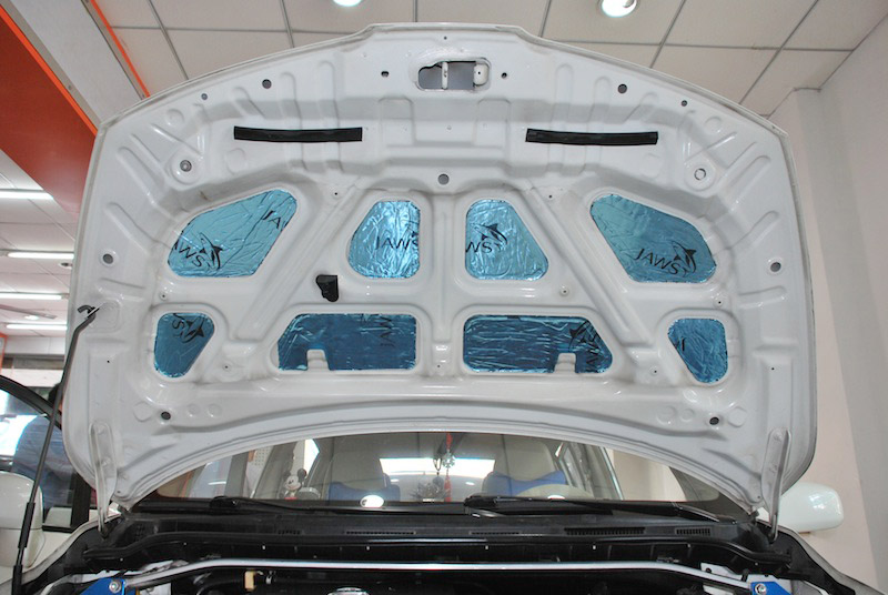 骐达引擎噪音处理已经做的非常不错了,在拆掉引擎盖原车的防护板后,我们可以看到钣金部位,首先在这一层我们安装钣金的形状裁切减震胶,压实后,再装一层引擎盖专用的隔热棉上去,一个是可以减震,再就是对抗引擎散热对漆面的伤害。大白鲨的引擎盖隔热膜做了特别的开孔铝箔设计,车主不用担心这层铝箔反射发动机热量了。